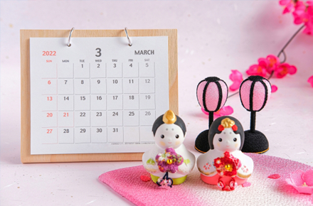 ひな人形に「桃の花」や「春の花」、菱餅や雛あられなどを飾って楽しみます。