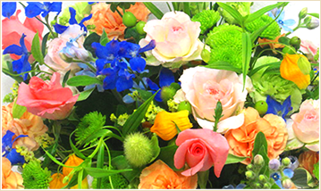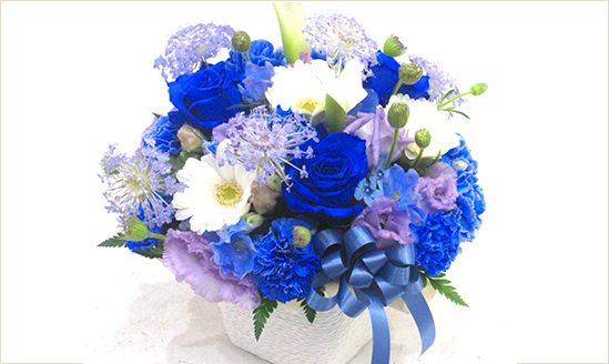 また、欧米では花嫁が「何かひとつ青いもの(サムシングブルー)」を身につけると幸せになれるという習慣があり、お二人の幸せを願う気持ちを込めて、ブルー色の入ったお花を贈っても良いと思いますよ。