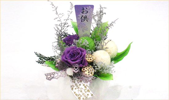 大きさは色々。こちらも手間がなくすぐ飾れるので喜ばれます。暑いこの時期にはピッタリな枯れない魔法のお花。ご仏壇の脇に飾れたりと大きさは色々。