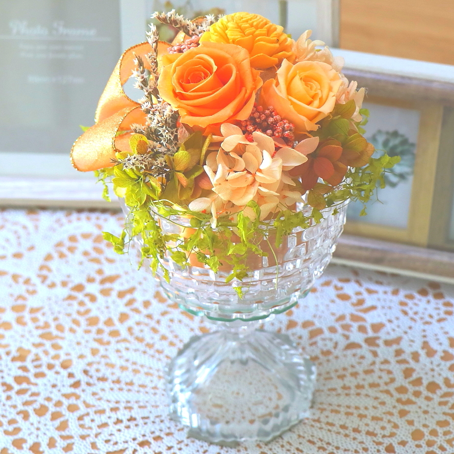 プリザーブドフラワーは、全くお手間がかからず、ずっと美しいままで、半永久的に鑑賞できます。他商品と比べると少々小ぶりですが、色々な場所にずっと飾っておけるのも魅力ですね。
