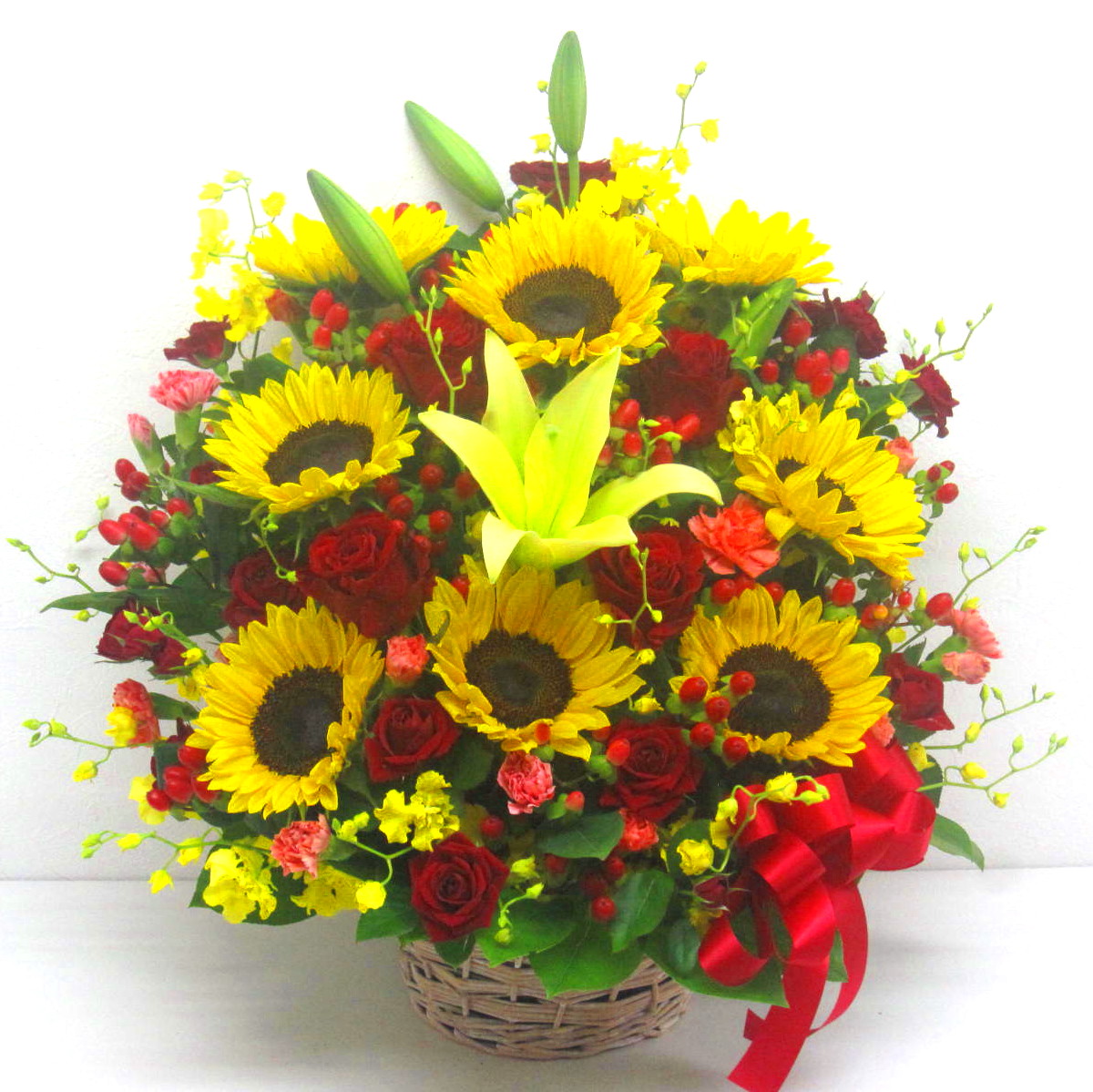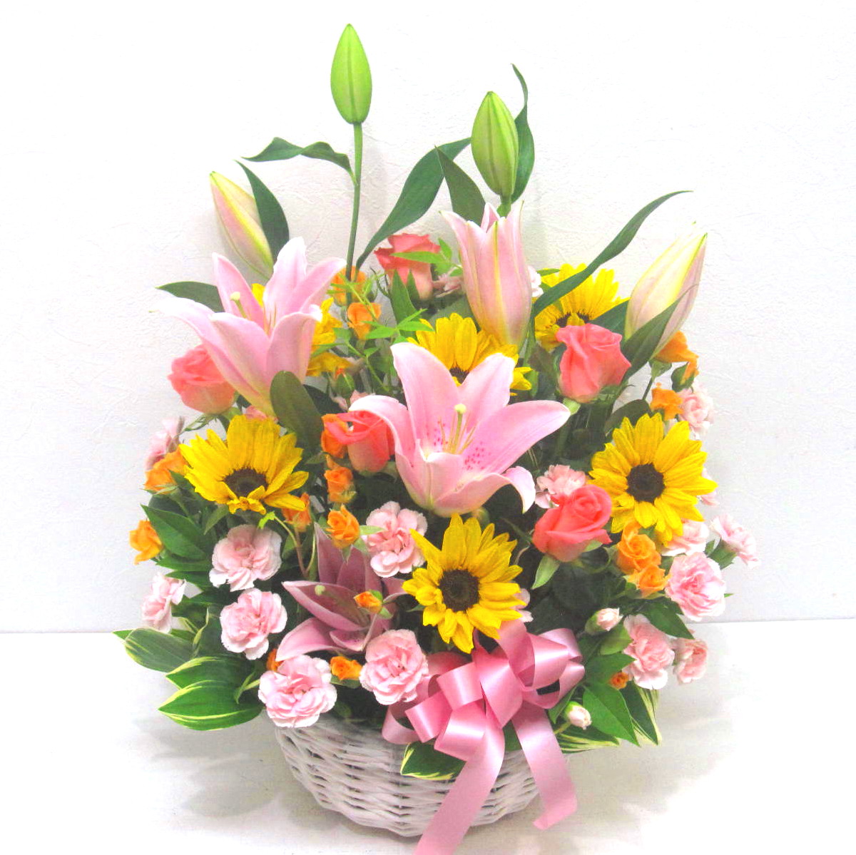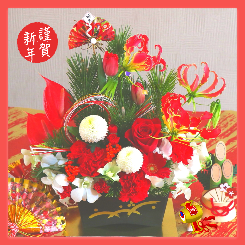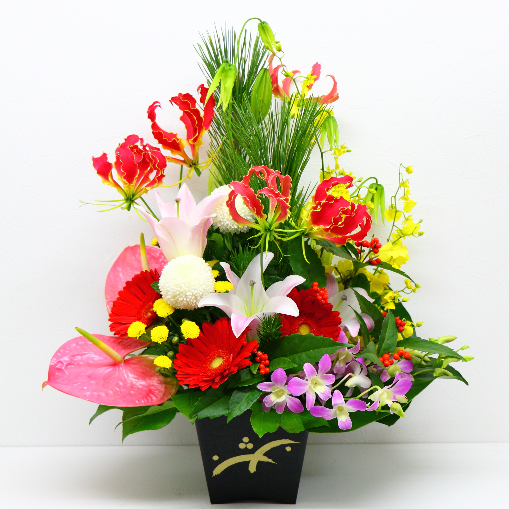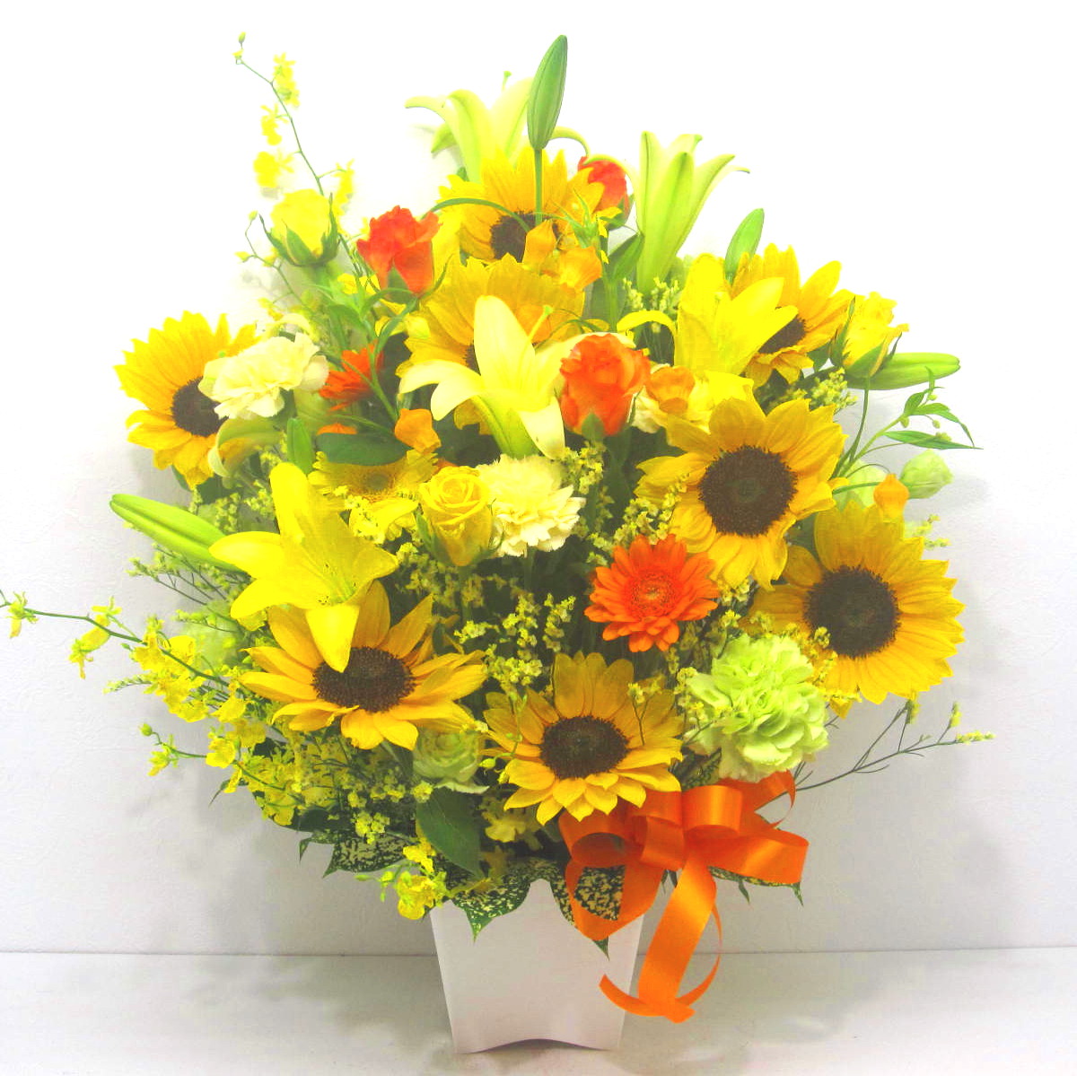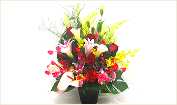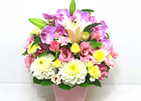 アレンジメントは、気軽に店舗のカウンターやテーブルに飾れて、オフィスや医院の玄関や室内を明るく彩ってくれます。また、スタンド花や胡蝶蘭に比べて贈り先の方に、値段(相場)がわかりにくい所も良いですね。 -
