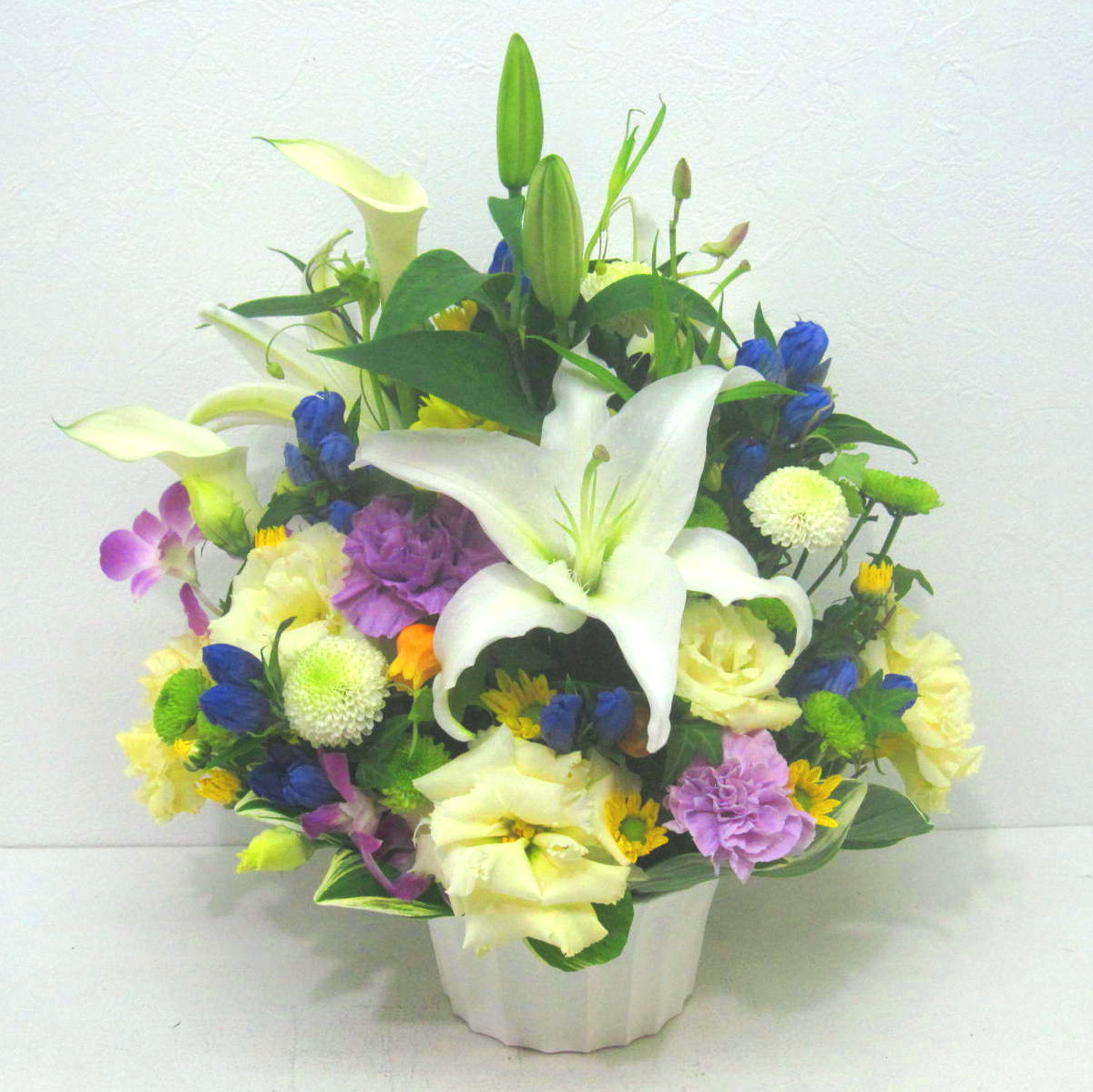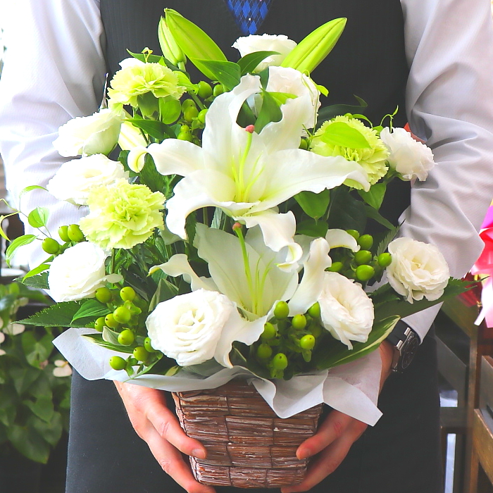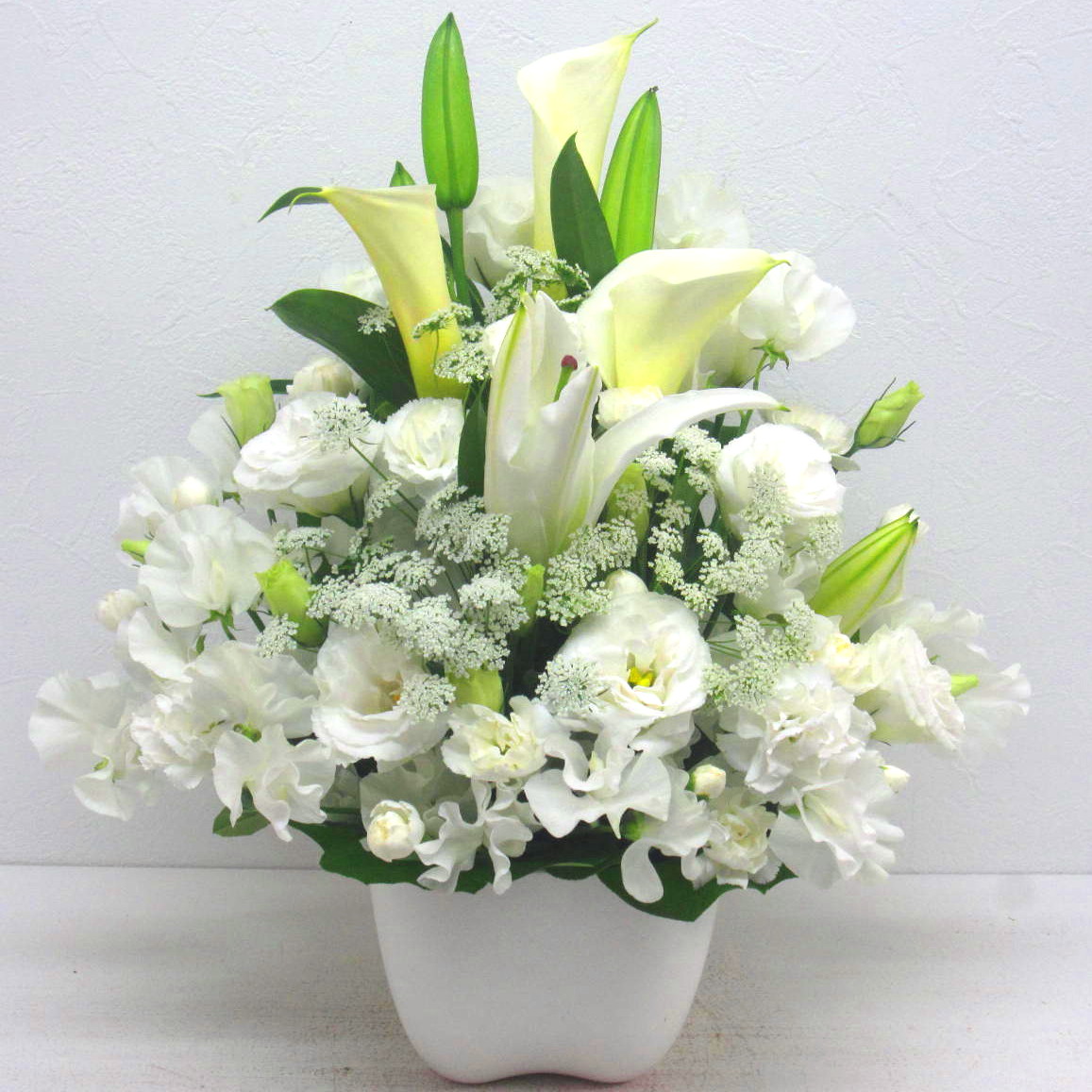 故人を偲ぶ白上がりの洋花のみのアレンジメント
