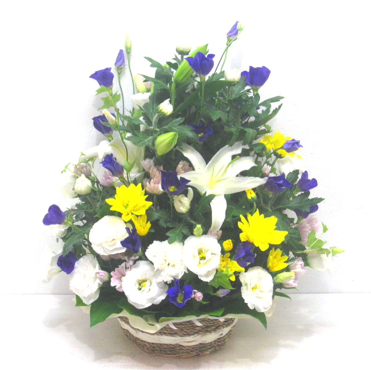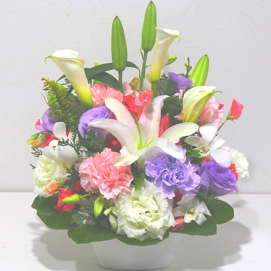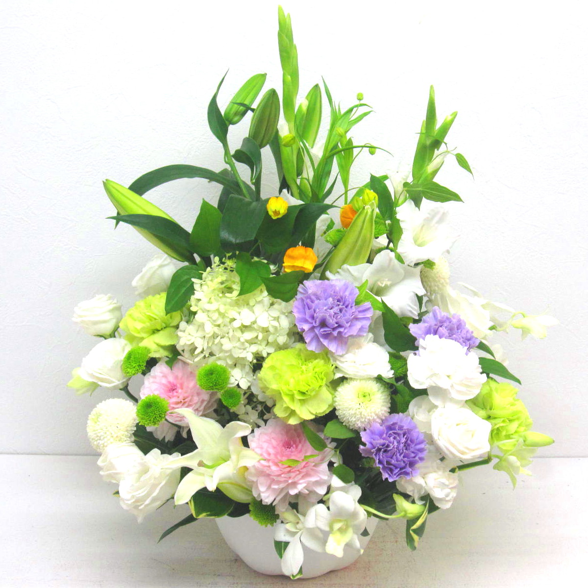 《春のお供え》白系主体で淡いピンクやムラサキ色を入れたアレンジメント