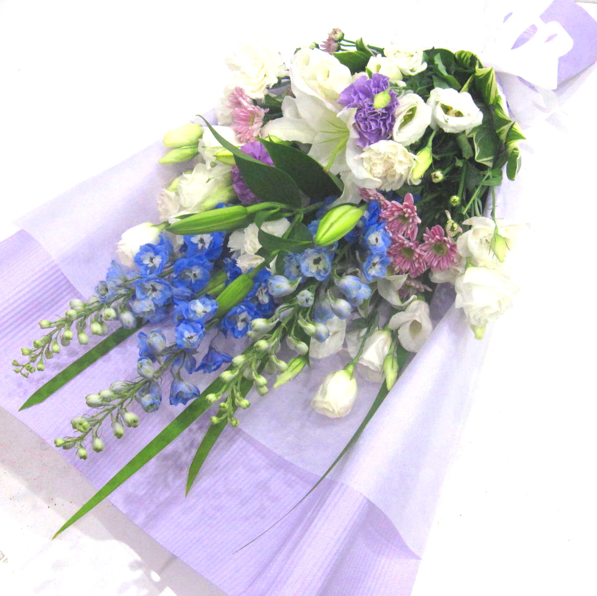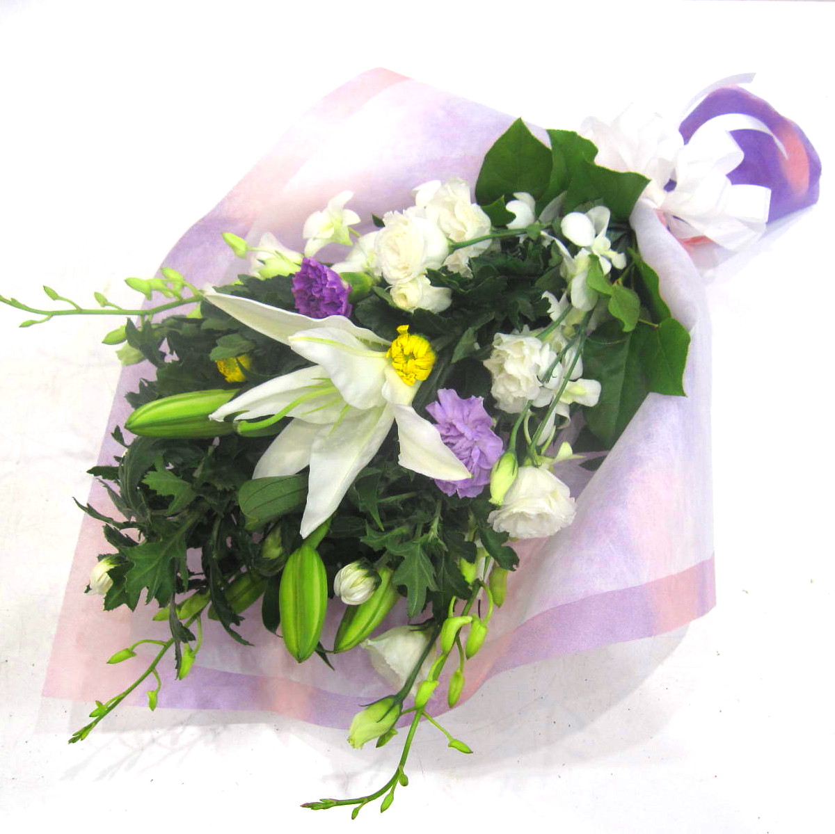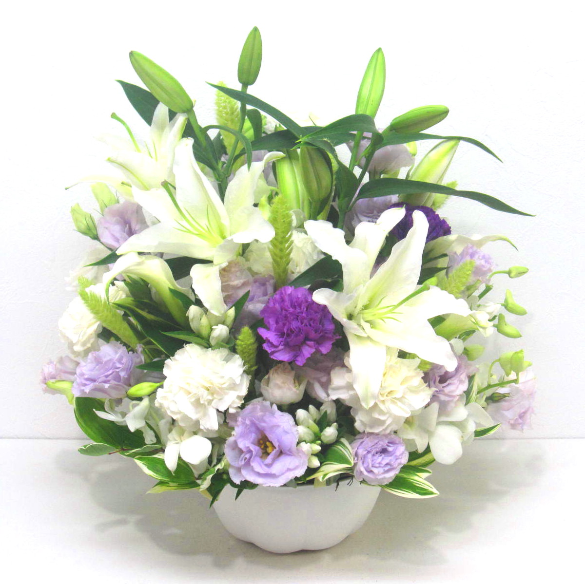悲しみに寄り添う白&パープル系のお供えアレンジメント