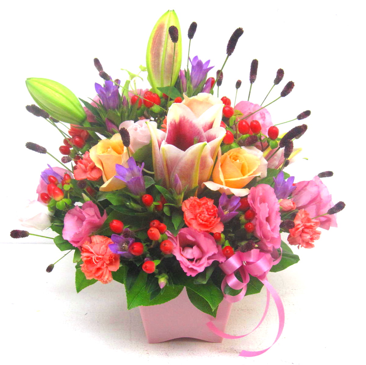 ピンクユリを入れた秋のアレンジメント