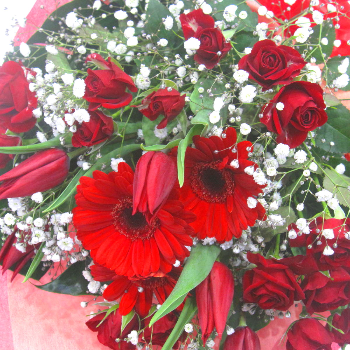 花材: メイン チューリップ、ミニバラ、ガーベラなど その他 かすみ草、葉物類など