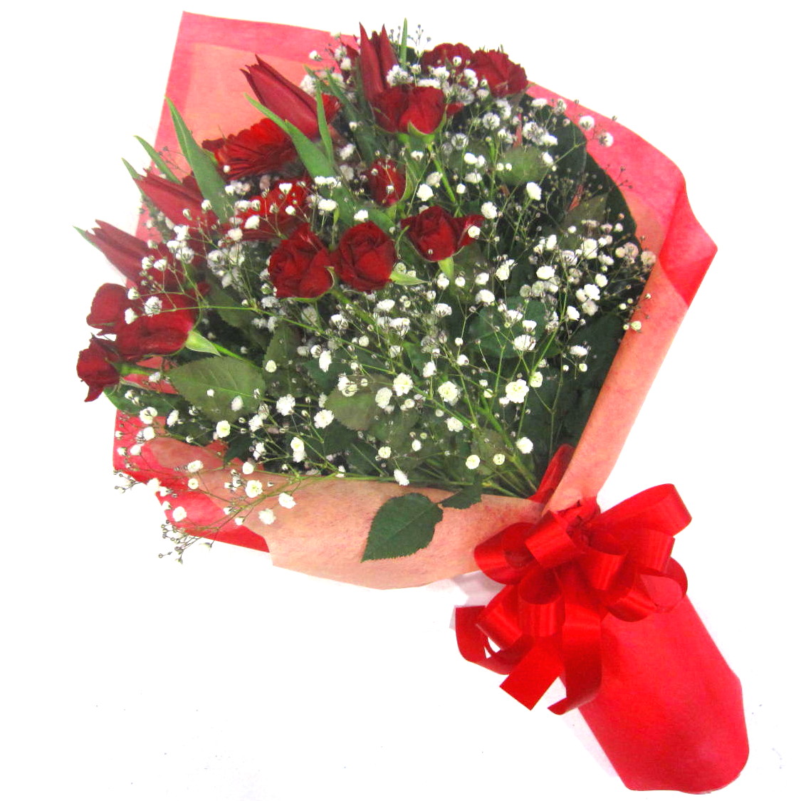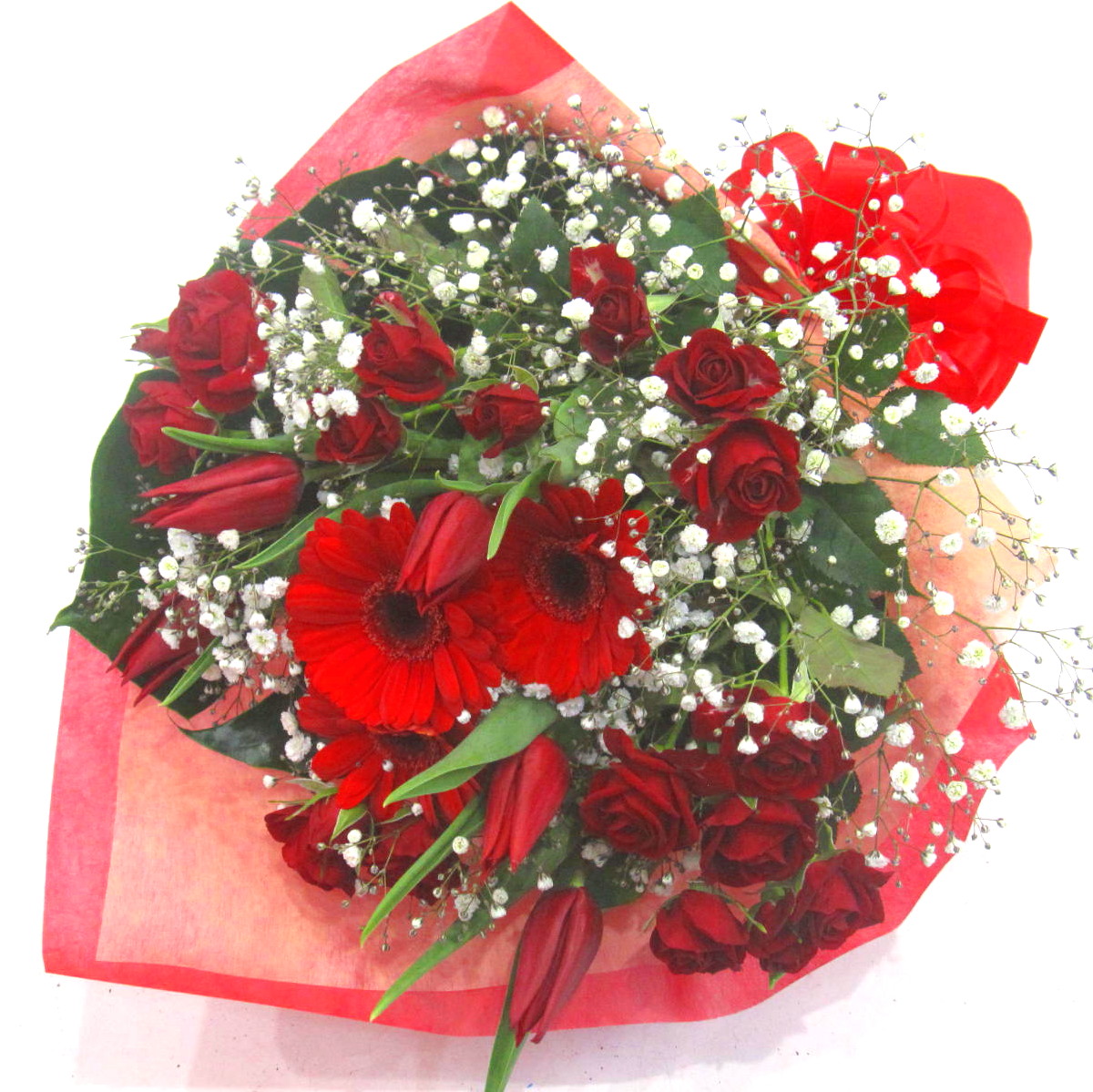 春のお花「チューリップ」と人気の高い「ガーベラ」や「ミニバラ」、「かすみ草」とあわせたボリューム感のある花束。【15時迄のご注文で翌日届きます】※こちらの商品についてのご相談、ご質問等ございましたら(メール)または(お電話)にて承ります。