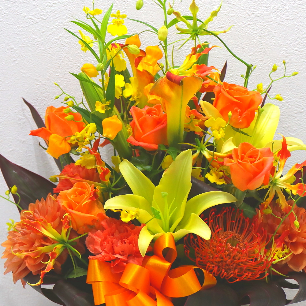 花材: メイン カラー、バラ、ダリア、カーネーション、オンシジュームなど その他 秋の小花、葉物類など