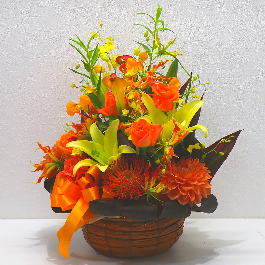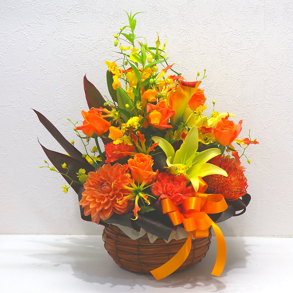 秋にオススメのアレンジメントです。黄色&オレンジ系の鮮やかな明るい秋の色合いがとっても素敵!きっと貰った方も嬉しいはずですよ!ボリューム感もあり華やかですよ。また、ご購入されたお客様から高い評価を頂いております。静岡県長泉町から日本全国【真心】込めてお届けいたします。さまざまなご用途に贈る贈り物としてオススメです。大切な方へ贈るフラワーギフトやプレゼントなら「花樹園オンラインドットコム」に是非、お任せ下さいませ。