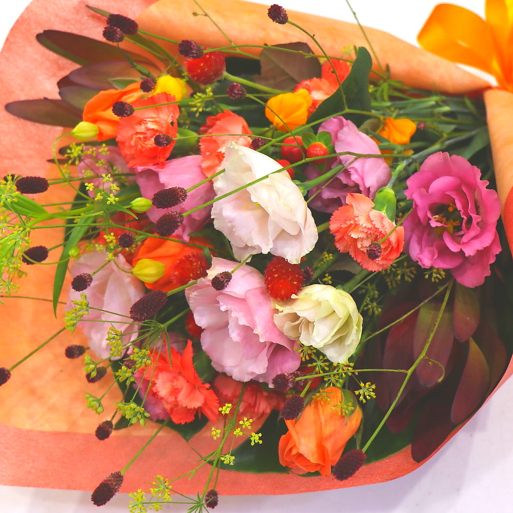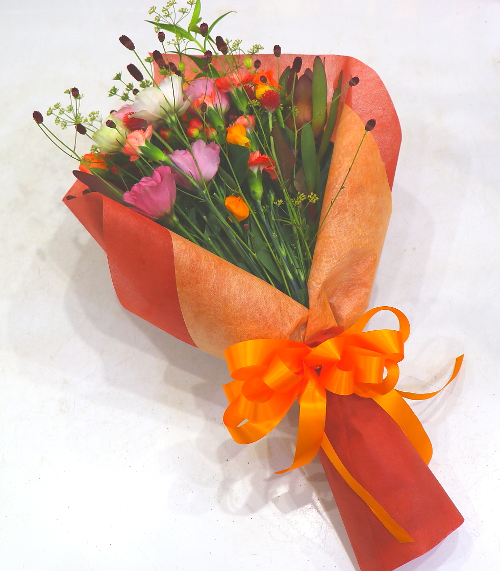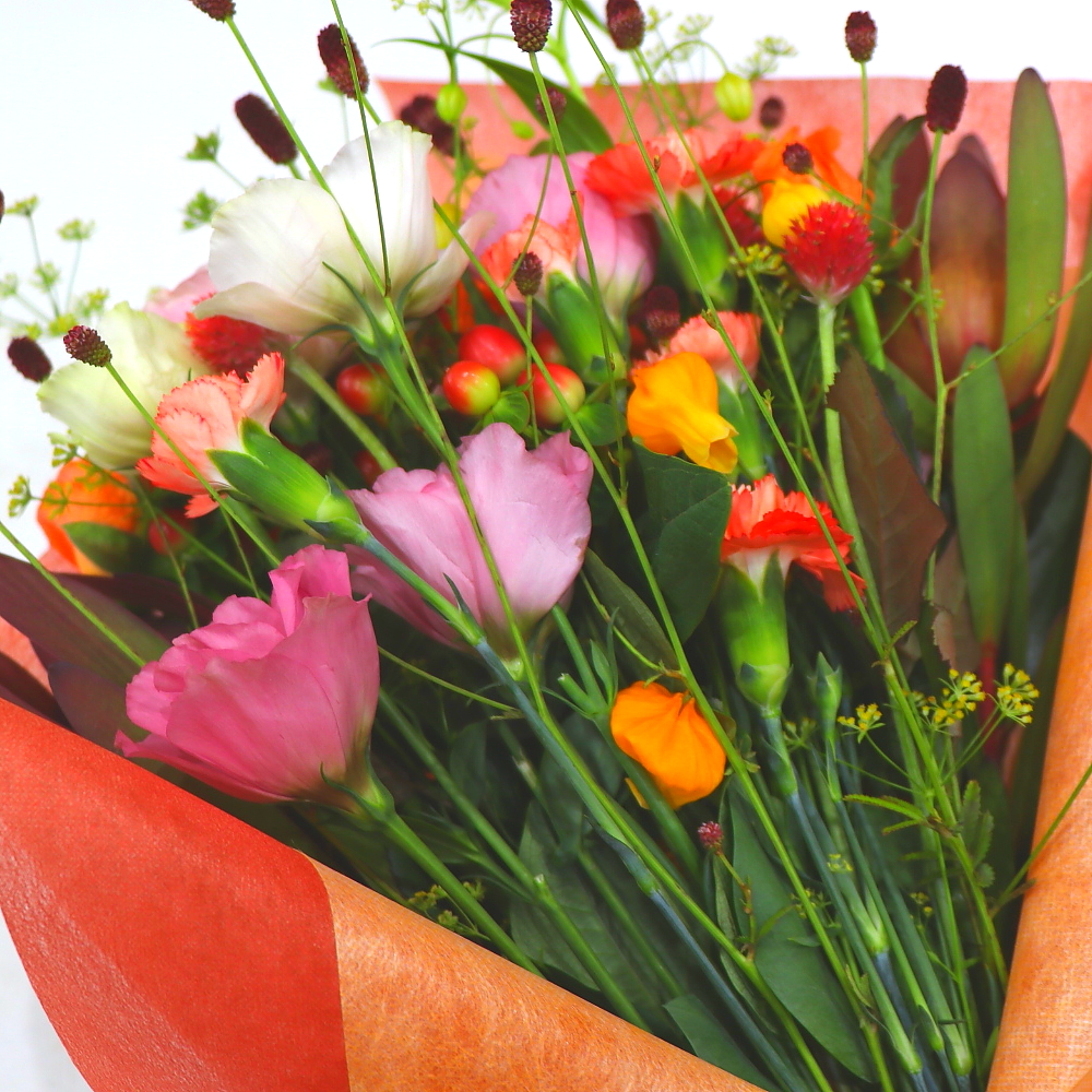 秋らしいにぎやかな色合いの花束です。ラッピングも上品にお包み致します。秋の季節を贈る特別な花束を特別な日にいかがでしょうか。また、ご利用されたお客様から「大変花持ちが良い」と好評をいただいております。静岡県長泉町から日本全国【真心】込めてお届けいたします。さまざまなご用途に贈る贈り物としてオススメです。大切な方へ贈るフラワーギフトやプレゼントなら「花樹園オンラインドットコム」に是非、お任せ下さいませ。