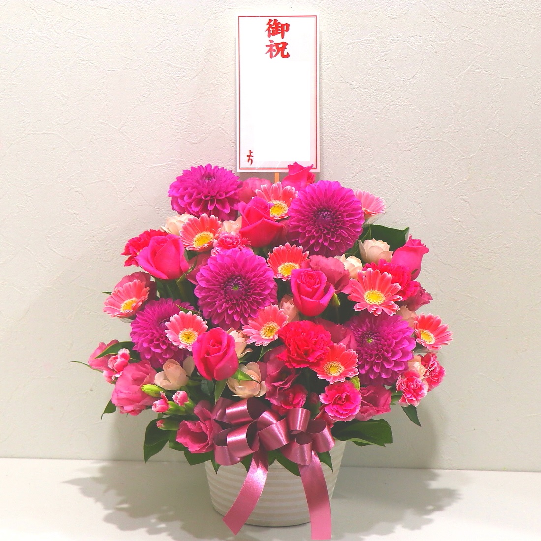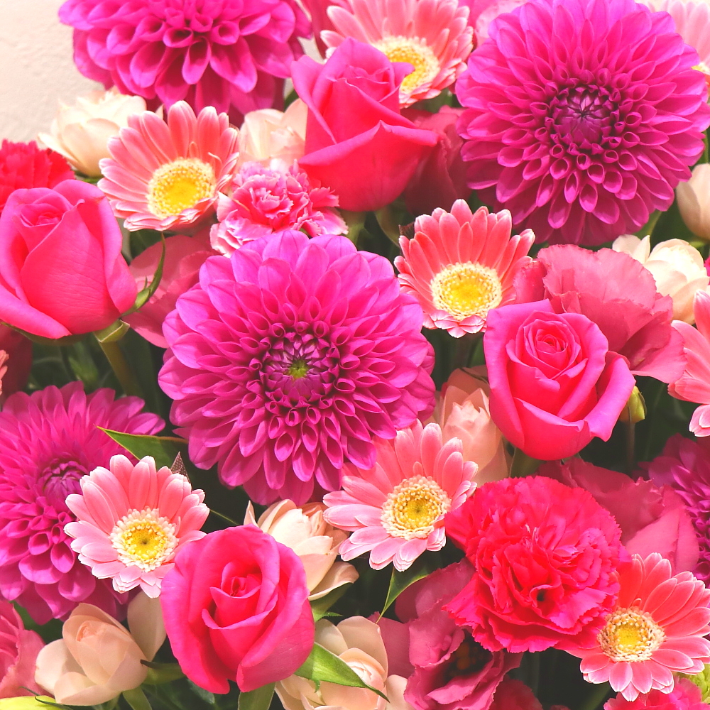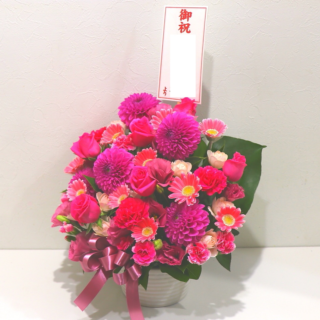 鮮やかなピンク色がとっても素敵なアレンジメントです。この季節らしい濃い鮮やかなピンク色がとても迫力があり華やかですよ。巨大輪の「ダリア」「バラ」を中心に上品にお作りします。名札もご要望に応じてお付けすることもできます。また、ご利用されたお客様から「大変花持ちが良い」と好評をいただいております。静岡県長泉町から日本全国【真心】込めてお届けいたします。大切な方へ贈るフラワーギフトやプレゼントなら「花樹園オンラインドットコム」に是非、お任せ下さい。