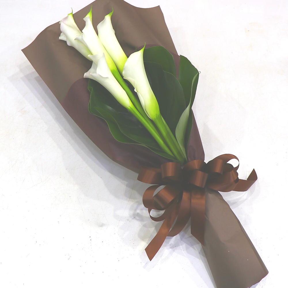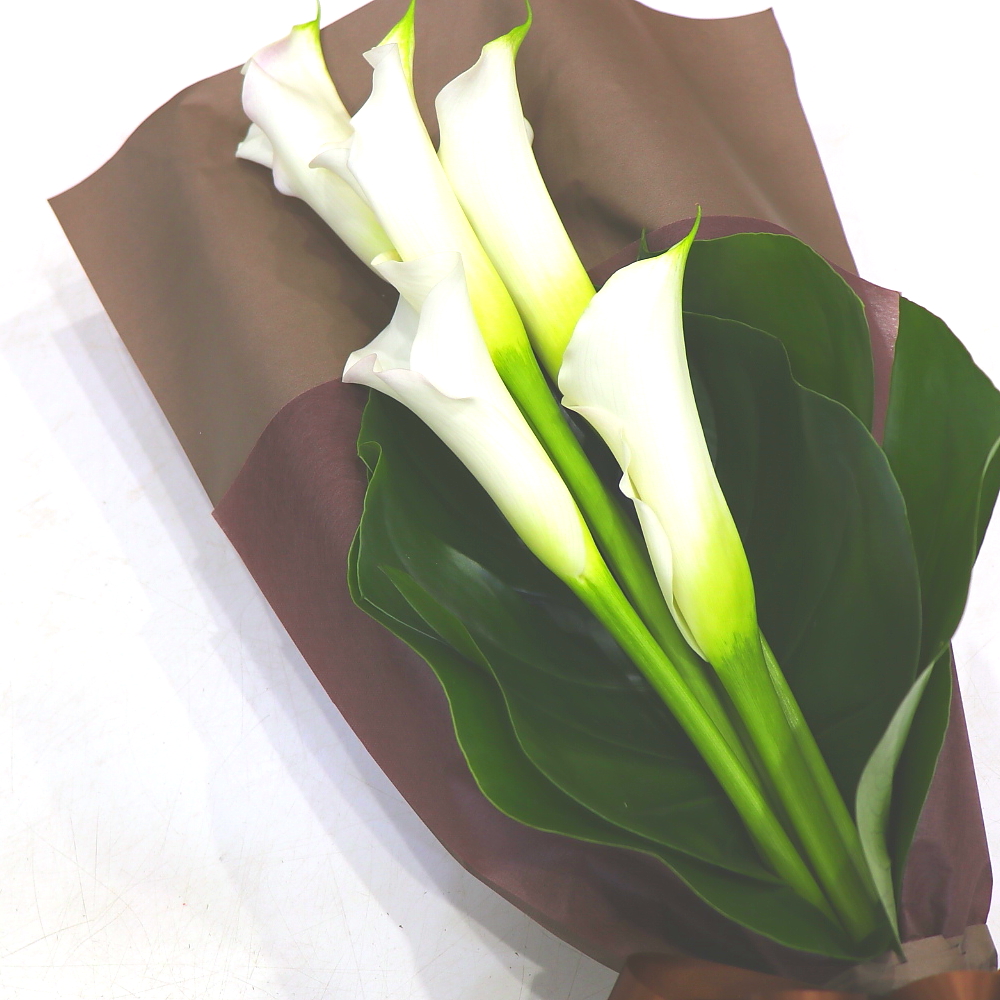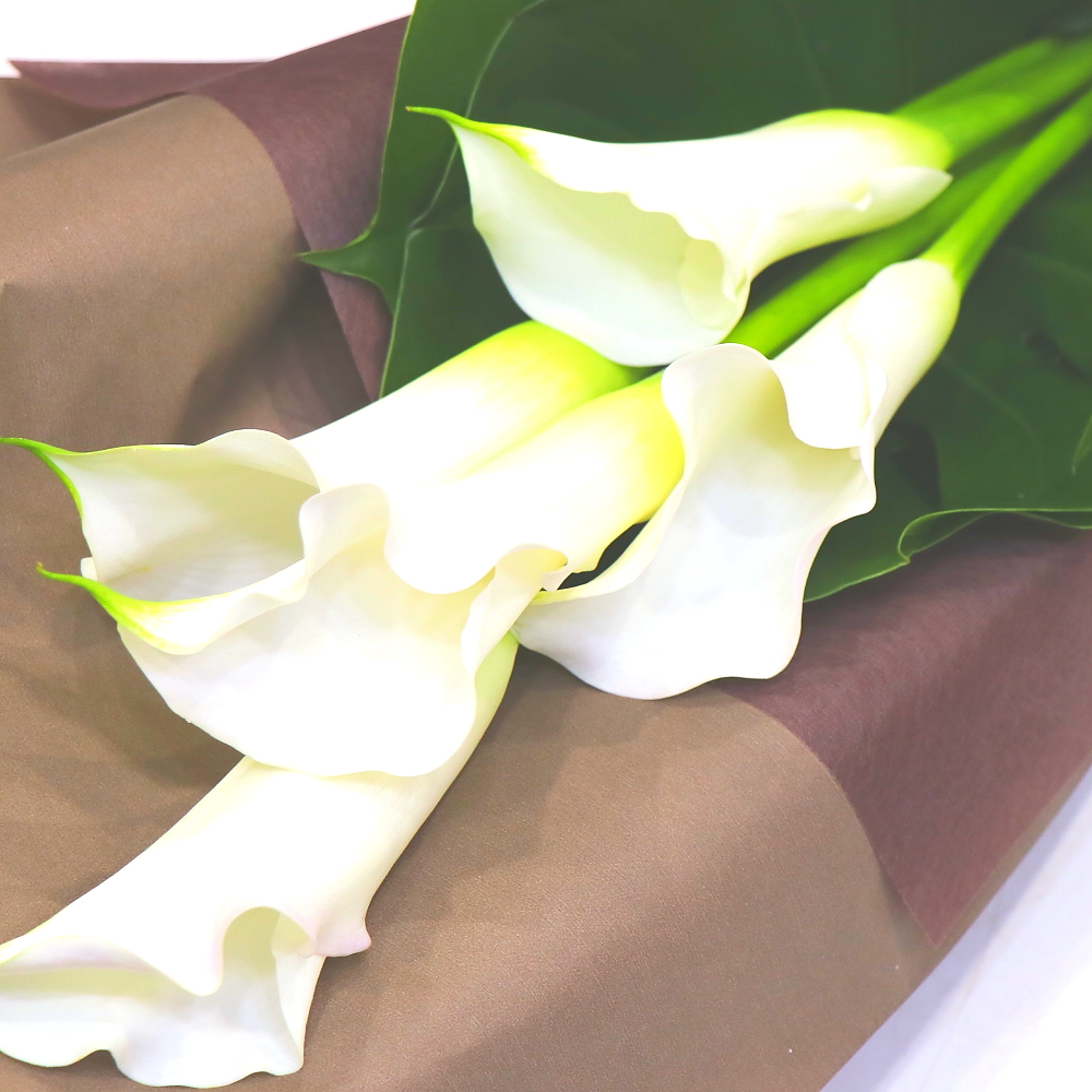 とても上品で素敵な花束です。カラーは、花びらの花に見える白い苞(ほう)を1枚くるりと巻いたシンプルな花です。そのカラーを5本、束にして高級感のある雰囲気でお包み致します。また、ご利用されたお客様から「大変花持ちが良い」と好評をいただいております。静岡県長泉町から日本全国【真心】込めてお届けいたします。ちょっといつもと変えたいと思う方の贈り物としてオススメです。大切な方へ贈るフラワーギフトやプレゼントなら「花樹園オンラインドットコム」に是非、お任せ下さいませ。