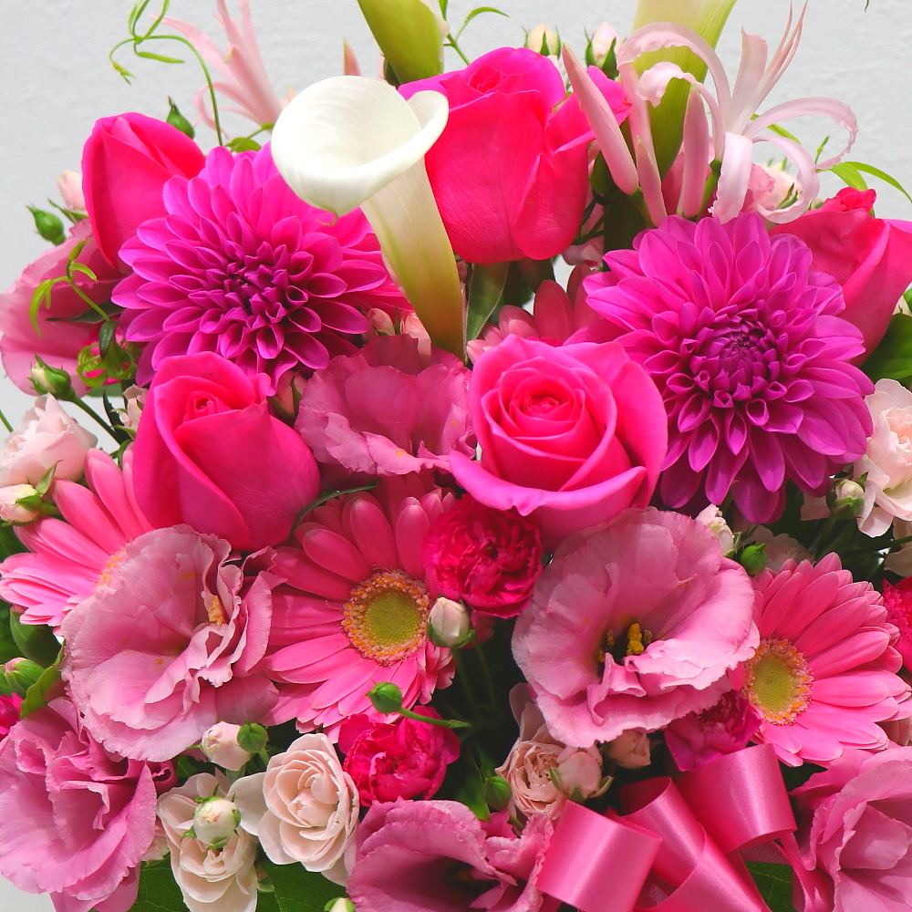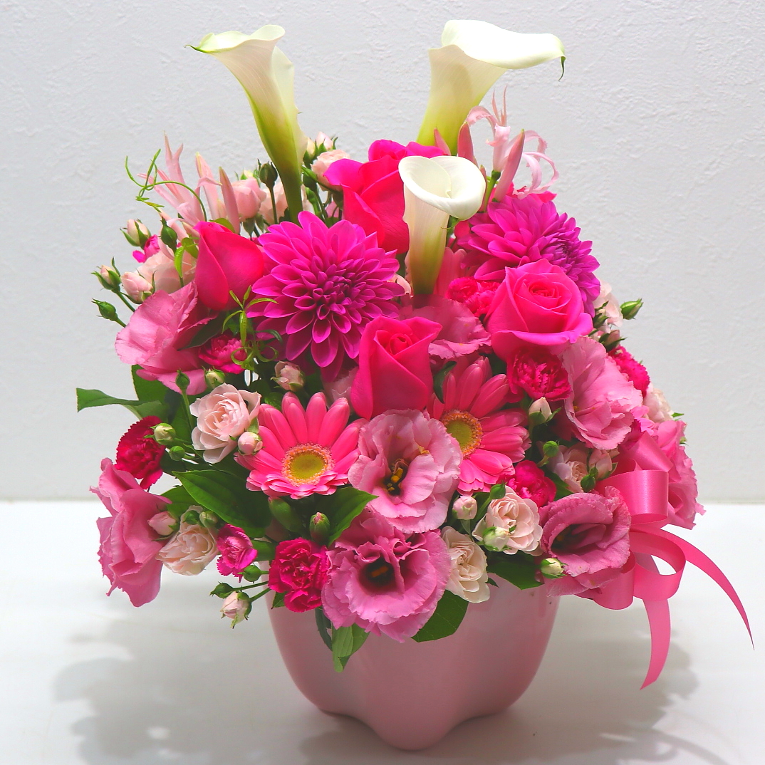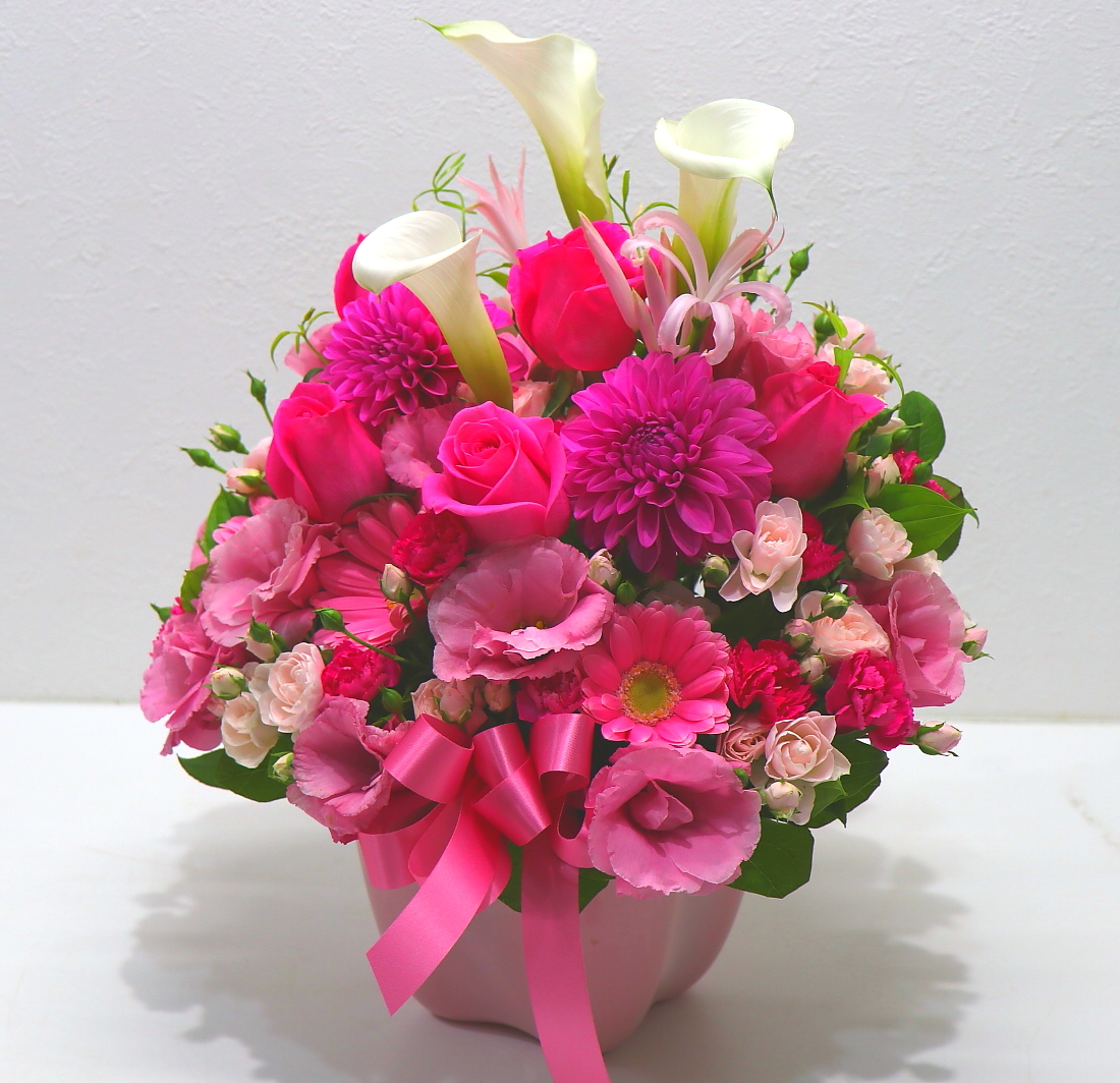 この時期が旬の「ダリア」を入れた濃い目のピンク系アレンジメント。濃いピンク系の色合いが深い秋の彩りを感じさせてくれますよ。秋のさまざまな贈り物にいかがでしょうか。【15時迄のご注文で翌日届きます】※こちらの商品についてのご相談、ご質問等ございましたら(メール)または(お電話)にて承ります。