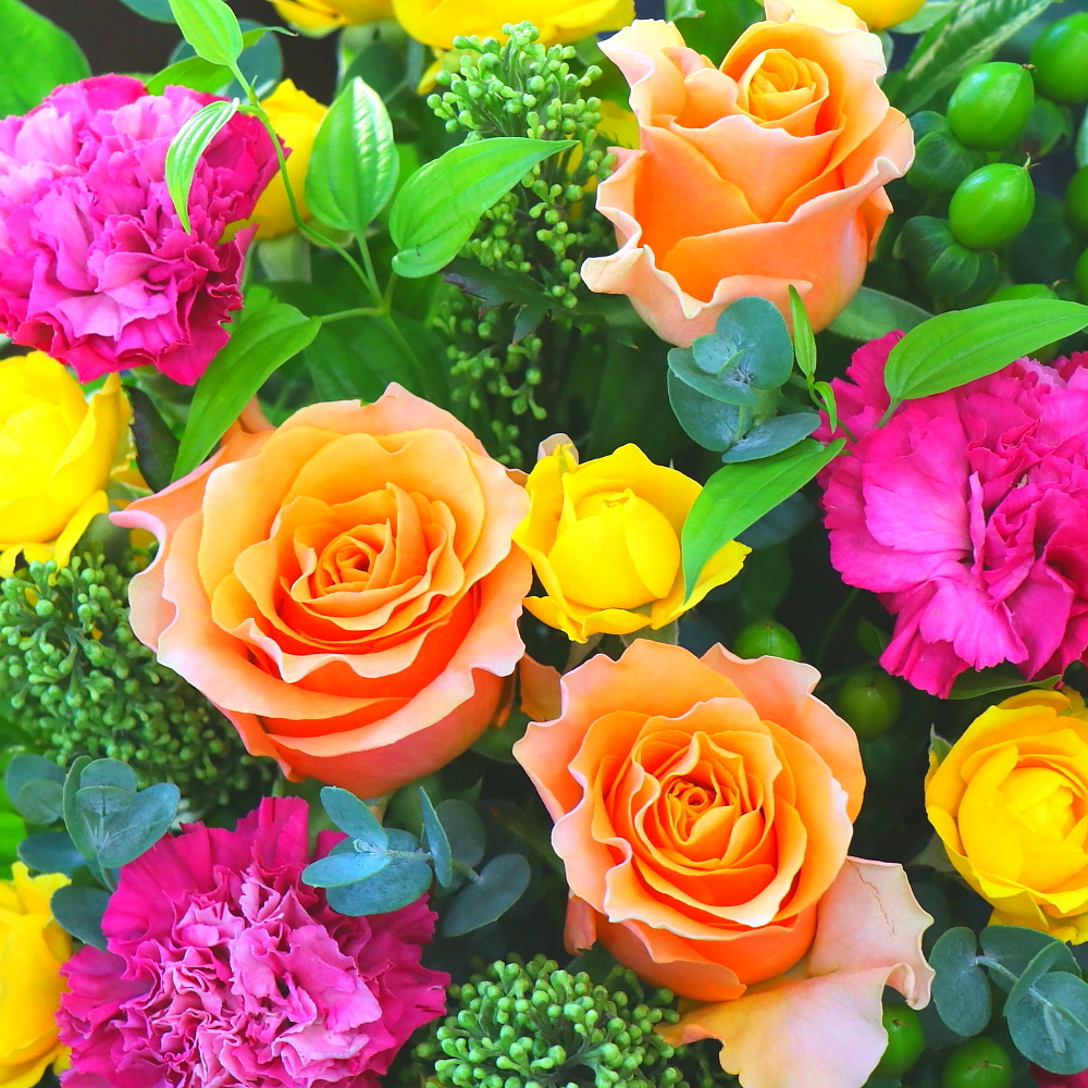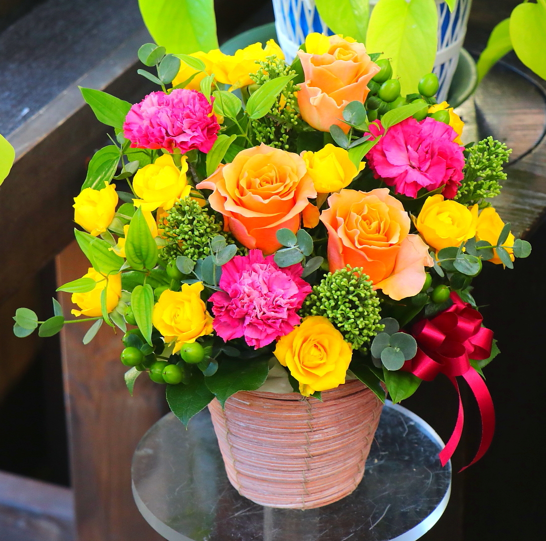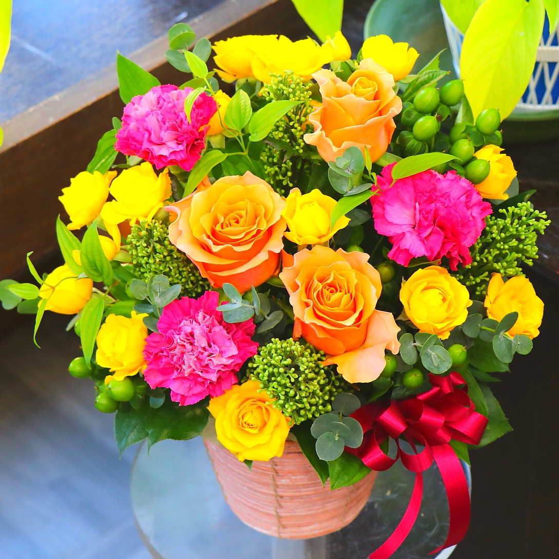 花材: メイン バラ、カーネーション、ヒペリカムなど その他 季節の小花、葉物類など