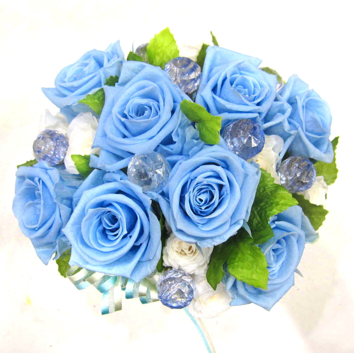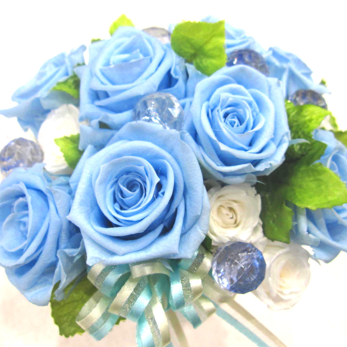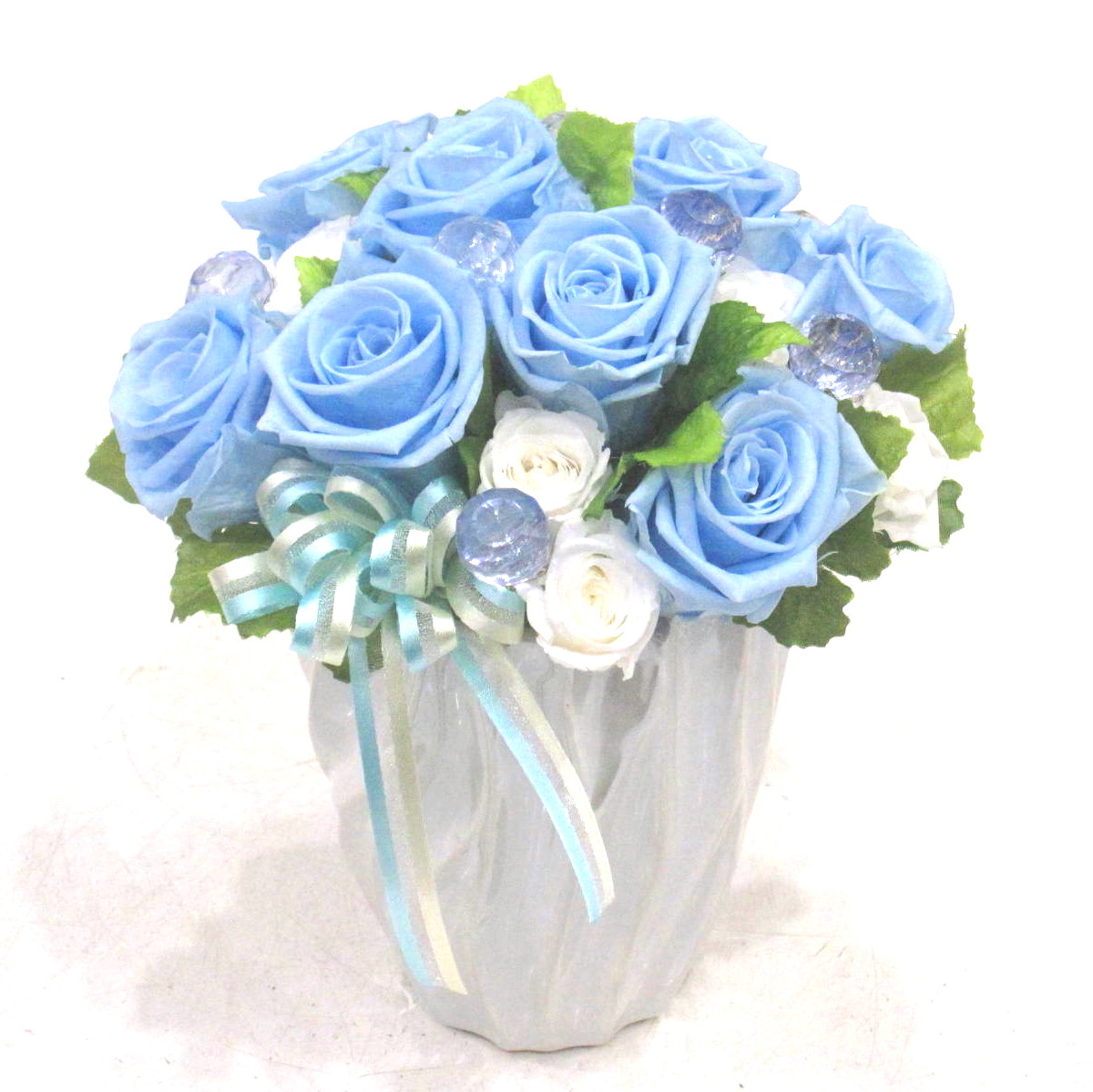 淡いブルーと白の高級ローズのプリザーブドフラワーをお洒落な花器にアレンジしました。淡いブルーと白バラとグリーンのみでシンプルに、そして水の雫をイメージしたクリスタルモニメントをバランスよく配置。みずみずしいプリザーブドローズをより一層の高級感溢れるアレンジにしました。どこから見ても綺麗に見えます。当店ではお客様の想い大切に【こころを込めて】お作りいたします。静岡県長泉町から手渡しお届けまたは宅急便で全国にお届けします。是非、プレミアムなさまざまな贈り物に。