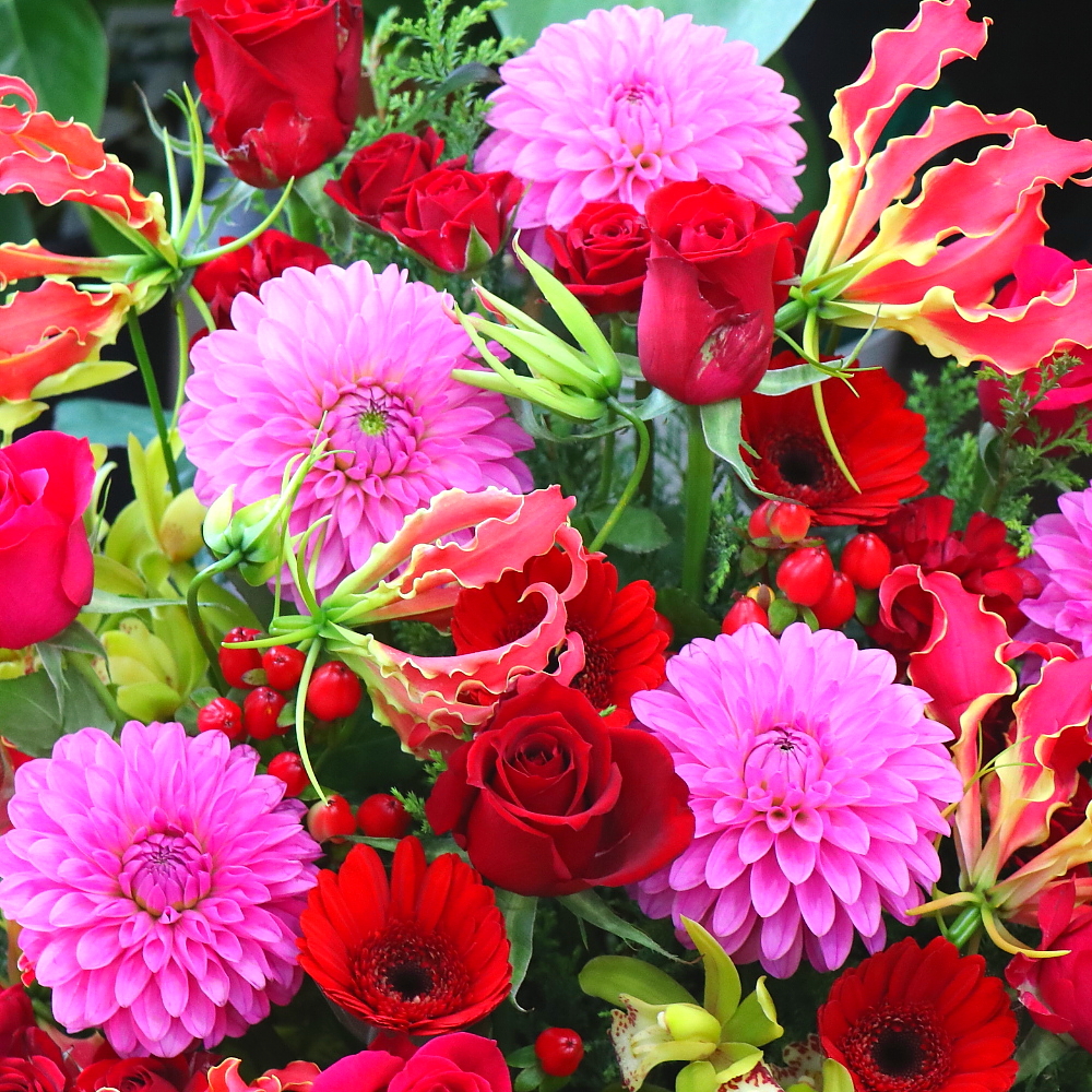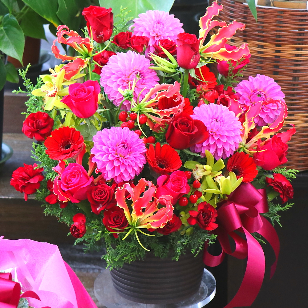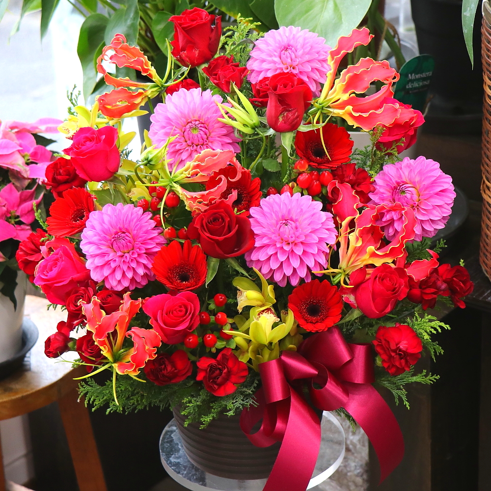花材: メイン ダリア、バラ、カーネーション、ガーベラ、グロリオサなど その他 実物類、葉物類など