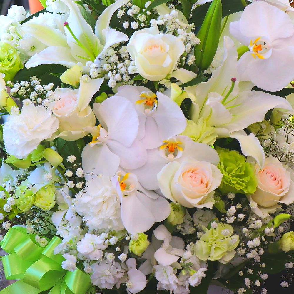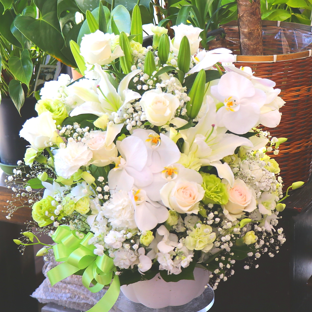 花材: メイン ユリ、バラ、カーネーション、コチョウラン、デンファレなど その他 かすみ草、葉物類など