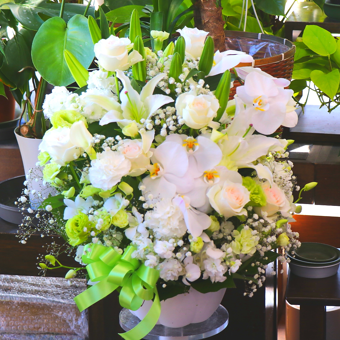 白系の清楚な雰囲気がとても素敵なアレンジメントです。存在感のある「ユリ」や「バラ」上品さをプラスして「コチョウラン」をアレンジしました。大きさもとっても華やかでボリューム感もあります。また、ご利用されたお客様から「大変花持ちが良い」と好評をいただいております。静岡県長泉町から日本全国【真心】込めてお届けいたします。大切な方へ贈るフラワーギフトやプレゼントなら「花樹園オンラインドットコム」に是非、お任せ下さい。