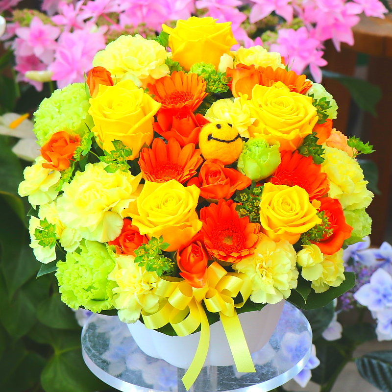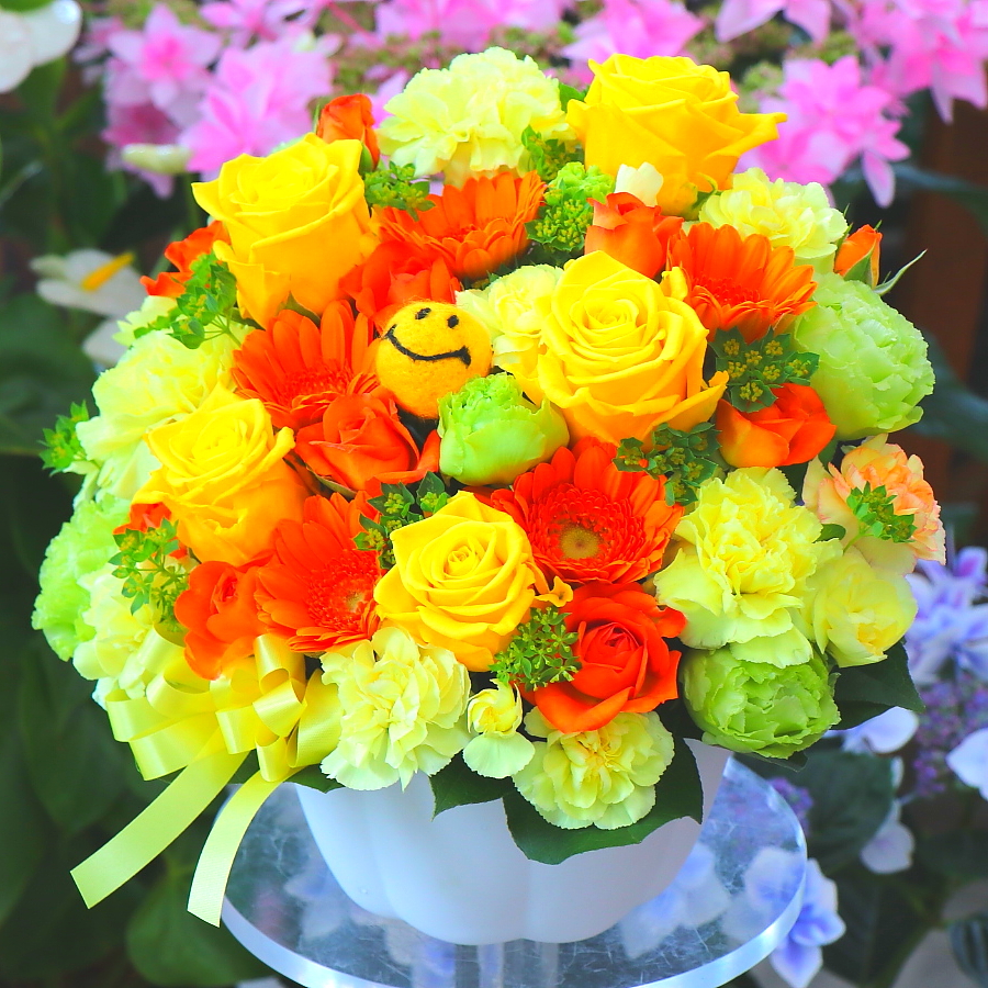 こんなご時世だからこそスマイルが大事!スマイルピック付きの明るいアレンジメントです。コロナに負けない明るいビタミンカラーの元気色です。【15時迄のご注文で翌日届きます】※こちらの商品についてのご相談、ご質問等ございましたら(メール)または(お電話)にて承ります。