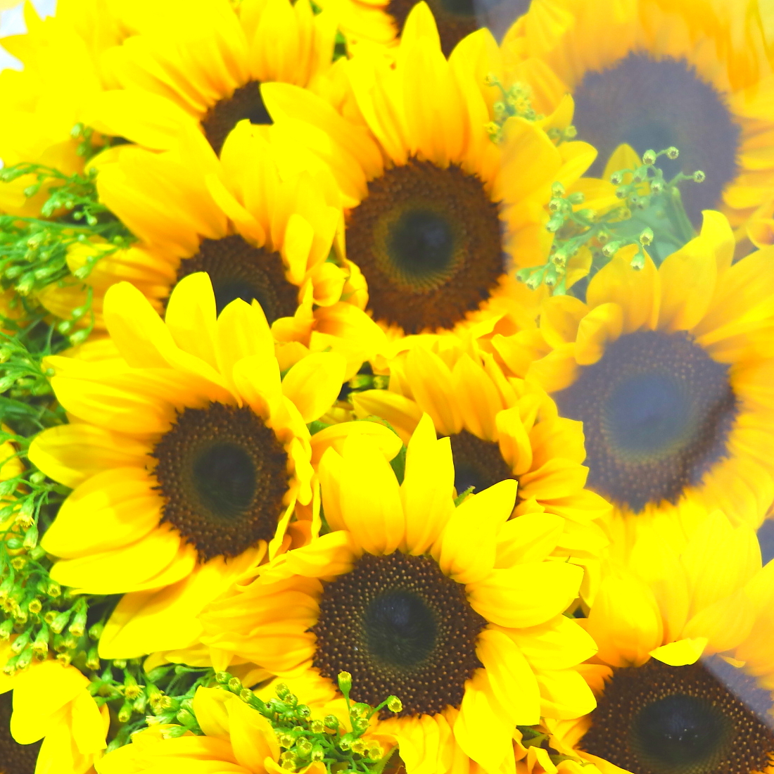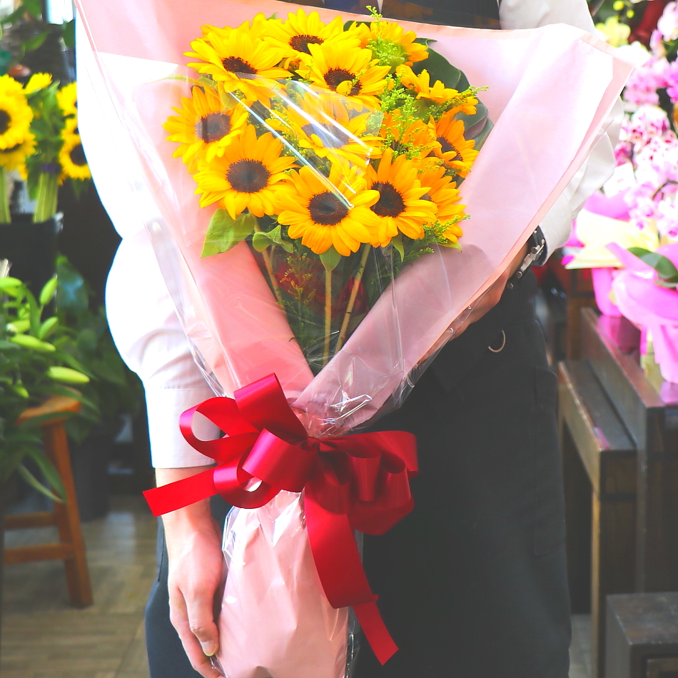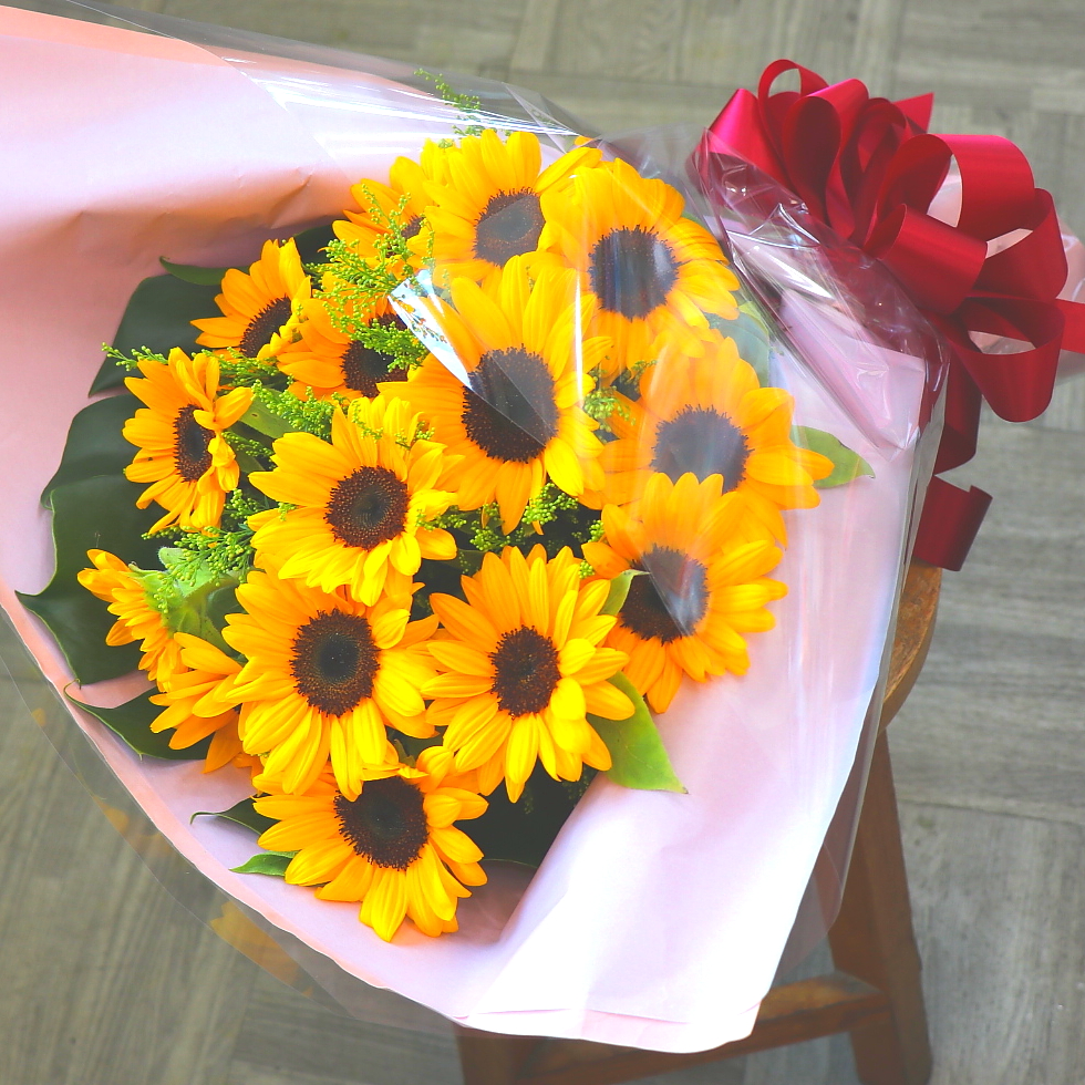 ひまわりの花言葉は「あなただけを見つめている」誕生日や記念日、プロポーズなどの特別な日に。ひまわりの花束をいかがですか?希望本数等がございましたらお気軽にお問い合わせ下さい。(画像は18本です。)