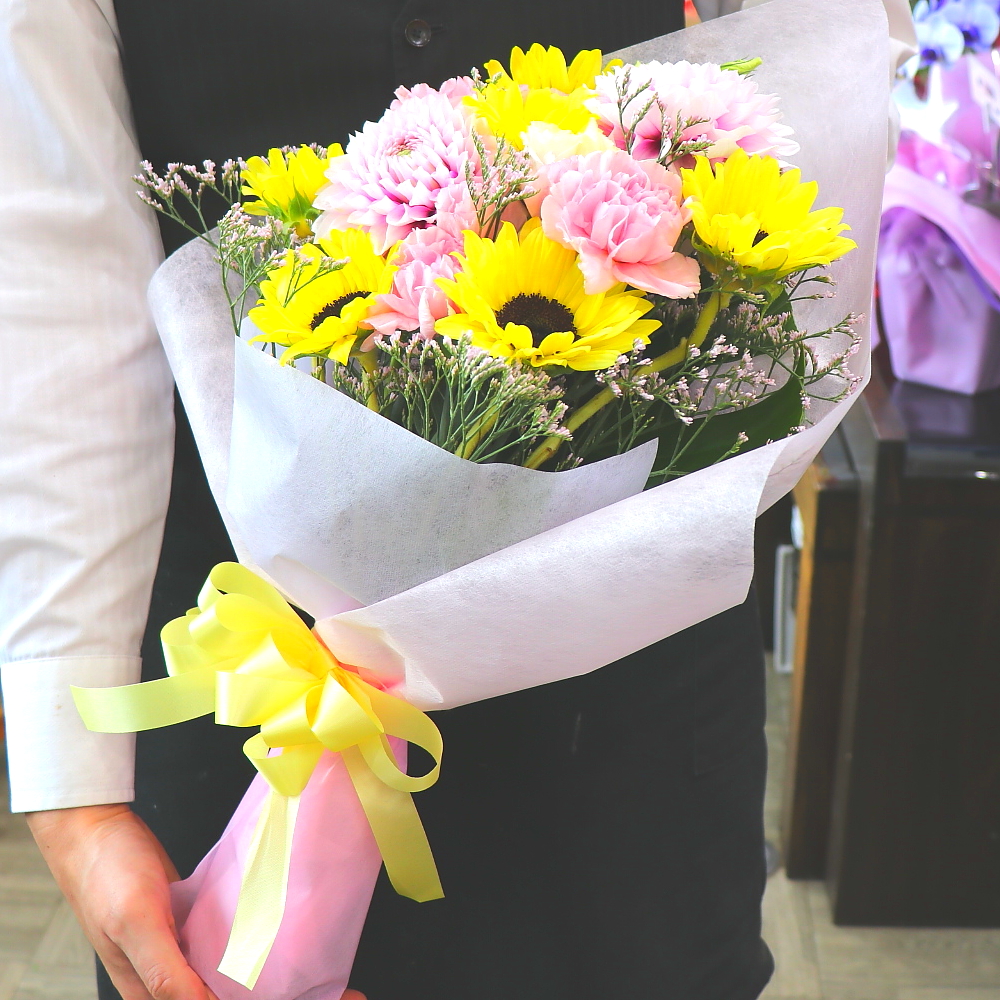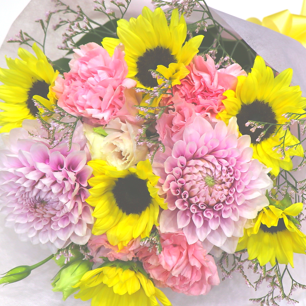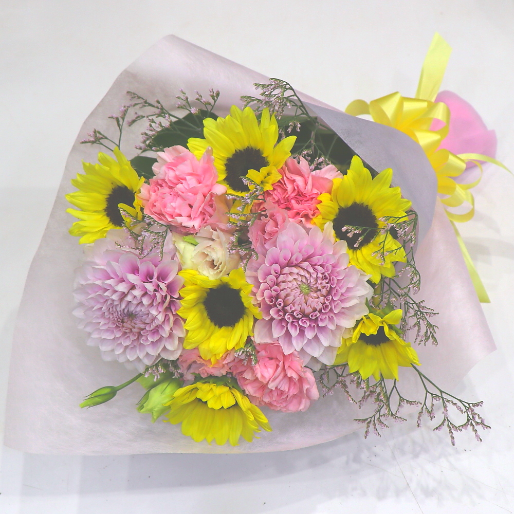 花材: メイン ヒマワリ、ダリア、トルコギキョウ、カーネーションなど その他 葉物類など