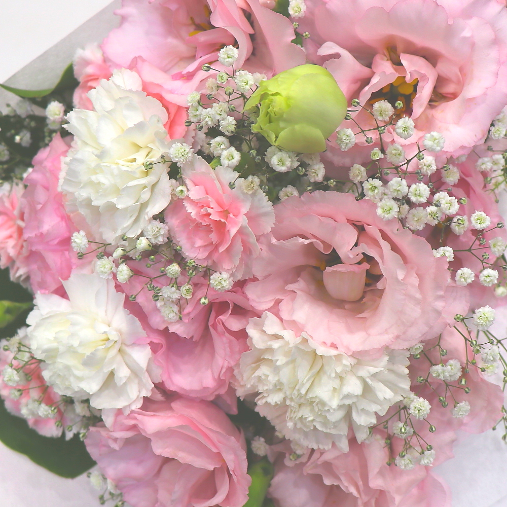 とても上品なピンク・白系の花束です。持ちの良い花材を中心にまとめてかすみ草も入っていてふんわりとボリューム感があります。もう亡くなってから何年も経った故人を偲ぶさまざまなシーンでお使い頂けます。
