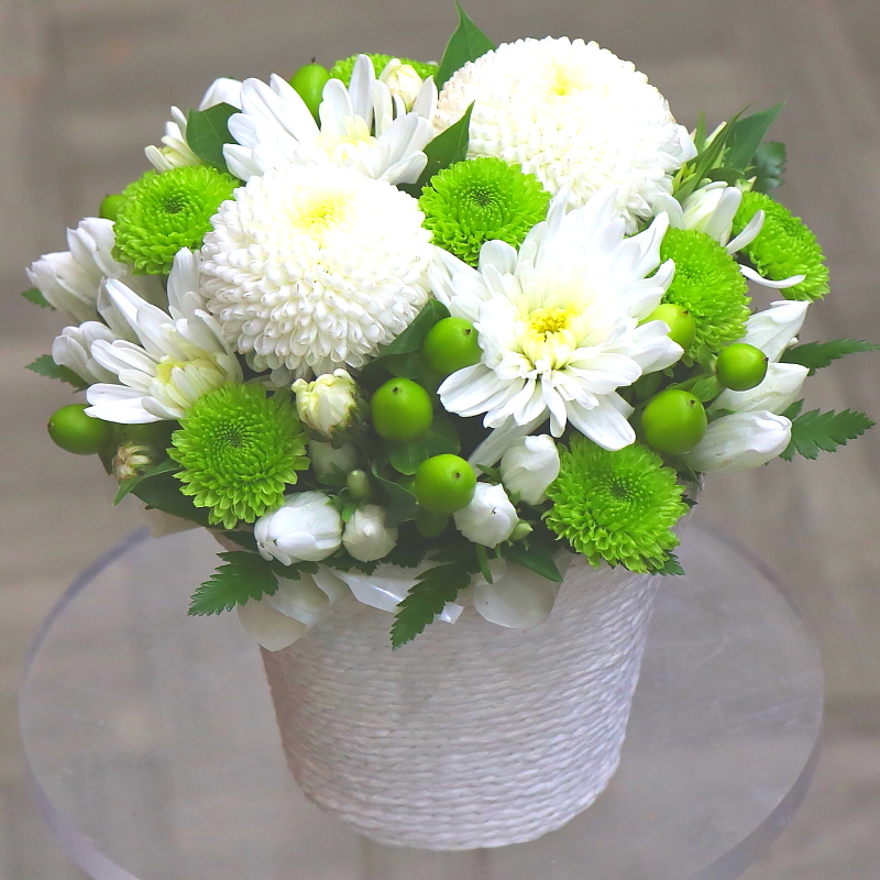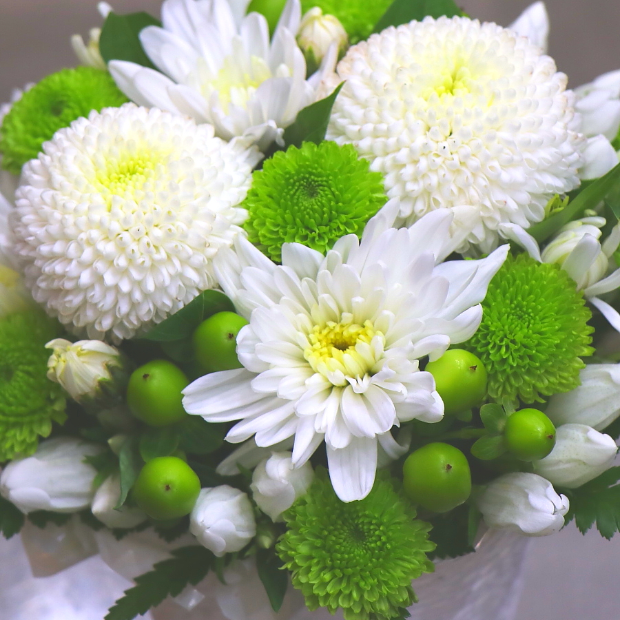 可愛らしいまあるい菊(ヨーロピアンマム)を入れたアレンジメントです。定番の菊には見えず、「ポンポンマム」とも言います。すごく花持ちも良いんです。そのマムを使って季節のお花も入れて可愛らしくお供え用にお作りしました。目を閉じて心の中にいる故人への想いをそっと呼び起こします。故人への供養はもちろん、ご家族やご遺族様の心を癒すことでしょう。当店では、お客様のその想いをしっかりと受け止め、心を込めて制作致します。故人を偲ぶ色々なシーンで是非、ご利用下さい。