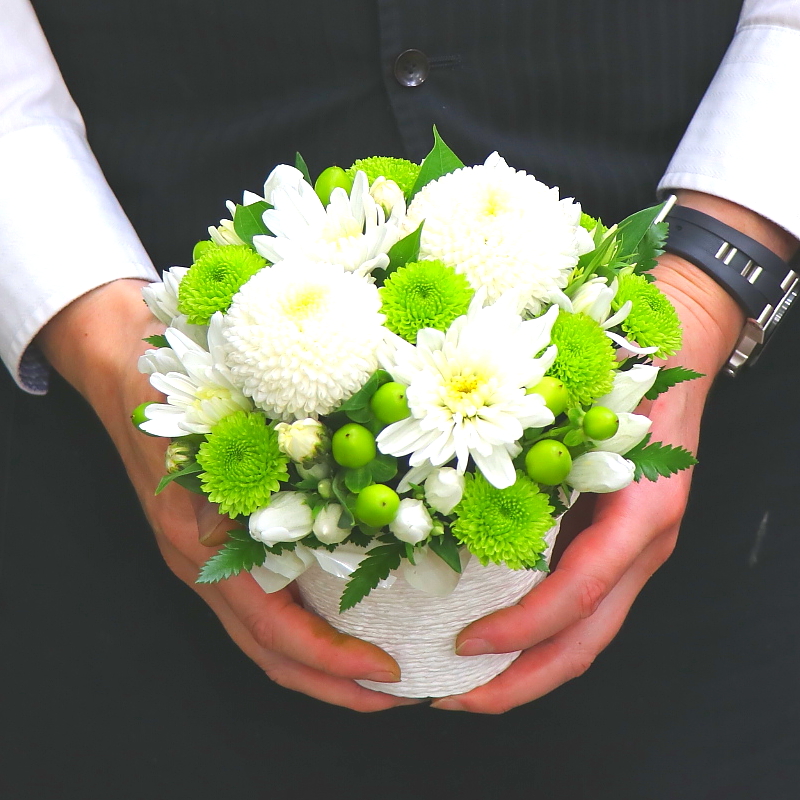 小さめのタイプのお供えアレンジメント。場所を選ばず、どこえでも飾れます。お供え・お悔やみやご命日、初盆・新盆などにオススメです。【15時迄のご注文で翌日届きます】※こちらの商品についてのご相談、ご質問等ございましたら(メール)または(お電話)にて承ります。