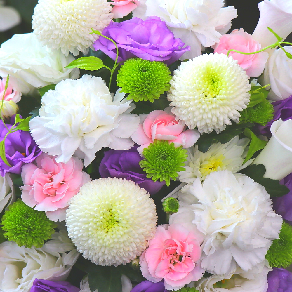 可愛らしいまあるい菊(ヨーロピアンマム)を入れたアレンジメントです。定番の菊には見えず、「ポンポンマム」とも言います。すごく花持ちも良いんです。そのマムを使って淡い色のお花も入れて明るめに上品なお供え用にお作りしました。目を閉じて心の中にいる故人への想いをそっと呼び起こします。故人への供養はもちろん、ご家族やご遺族様の心を癒すことでしょう。当店では、お客様のその想いをしっかりと受け止め、心を込めて制作致します。故人を偲ぶ色々なシーンで是非、ご利用下さい。