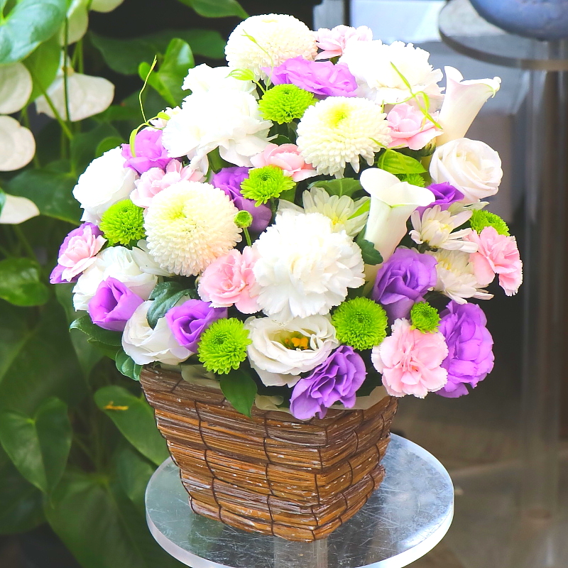 花材: メイン ヨーロピアンマム、カラー、カーネーション、トルコギキョウなど その他 葉物類など
