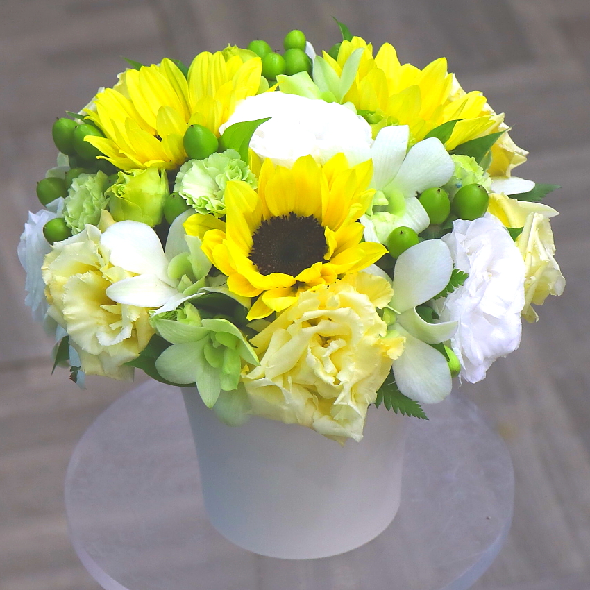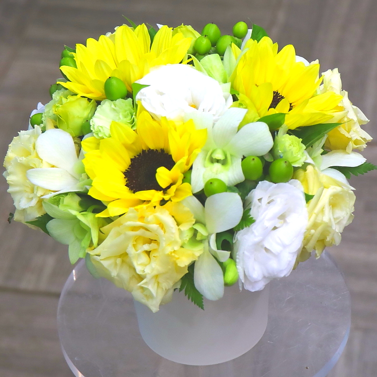 この時期に旬の向日葵を入れたアレンジメントです。黄色&白系の淡い優しい雰囲気でお作りします。オールラウンドタイプの四方見タイプなのでどこから見ても綺麗に見えます。大きさもコンパクトでご仏前周辺に飾りやすいです。目を閉じて心の中にいる故人への想いをそっと呼び起こします。故人への供養はもちろん、ご家族やご遺族様の心を癒すことでしょう。当店では、お客様のその想いをしっかりと受け止め、心を込めて制作致します。故人を偲ぶ色々なシーンで是非、ご利用下さい。