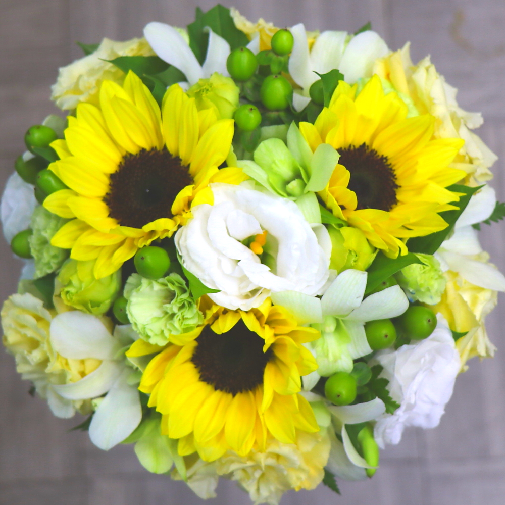花材: メイン ヒマワリ、トルコギキョウ、カーネーション、デンファレなど その他 実物類、葉物類など