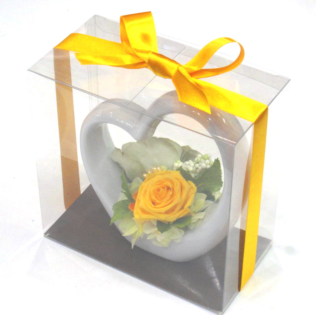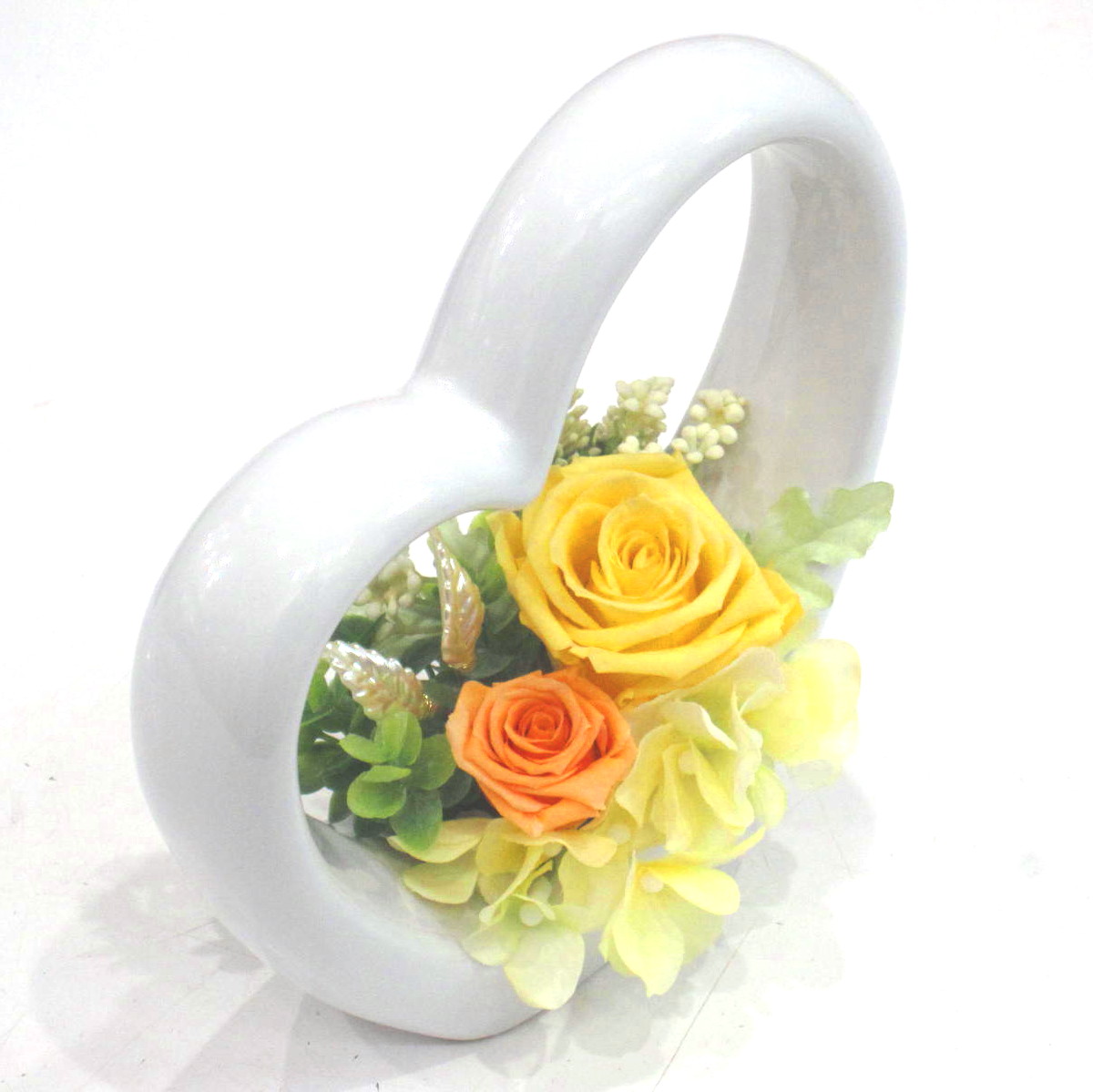 愛の雰囲気たっぷりのプリザーブドフラワーです。一言「可愛いです!!しかも花器もすごく素敵です!!」ハートの形をした素敵な花器にイエロー&オレンジ系のシンプルなスタイルでオールラウンドで製作。どこから見ても綺麗に見えます。大切な方に言葉では照れくさい想いをきっと届けてくれるプリザーブドフラワーです。当店ではお客様の想い大切に【こころを込めて】お作りいたします。静岡県長泉町から手渡しお届けまたは宅急便で全国にお届けします。是非、さまざまな贈り物に。
