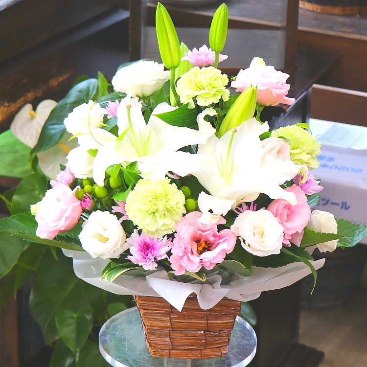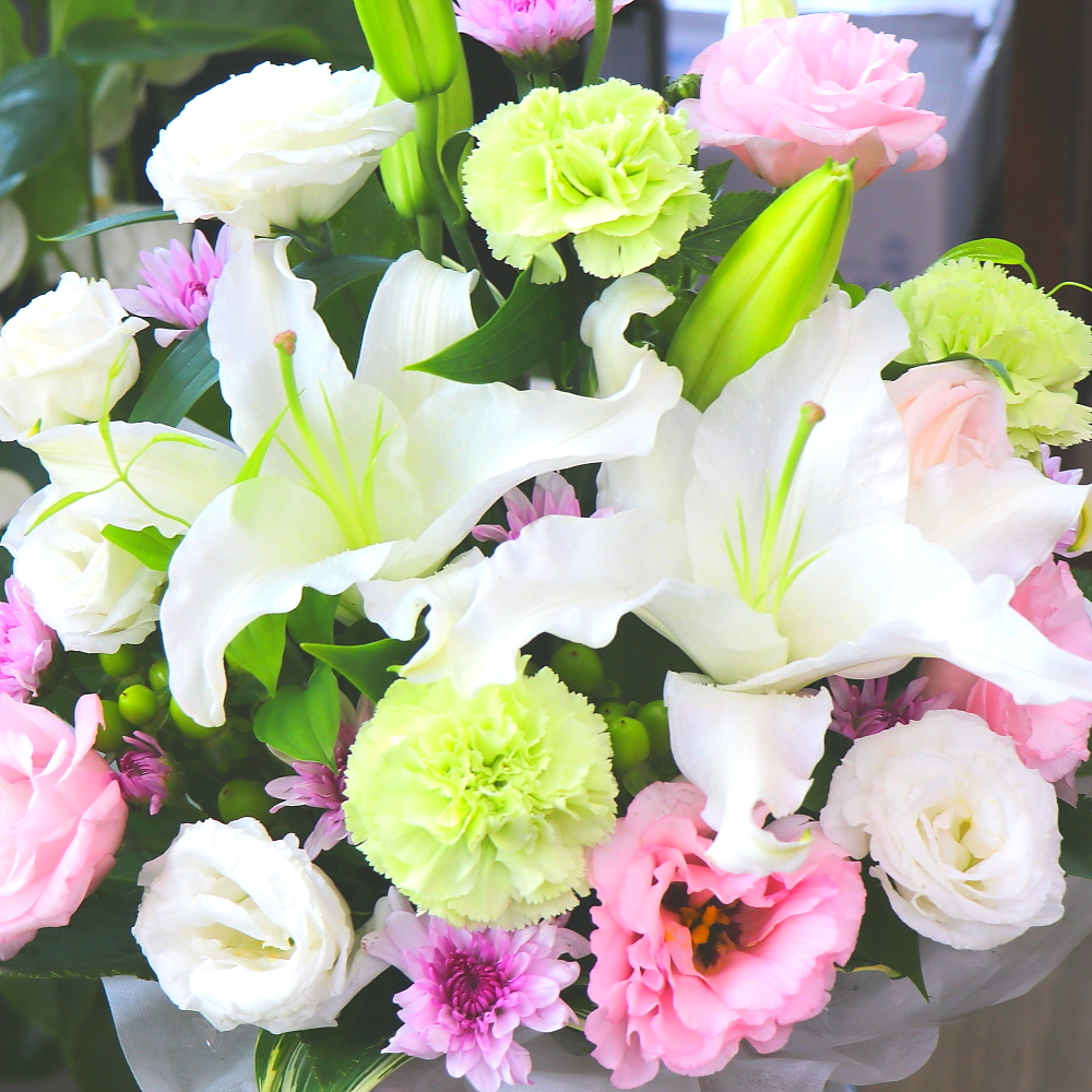 白系を基調とした淡い優しい色合いのアレンジメントです。ユリやカーネーション、トルコギキョウなど花持ちも良いお花を中心に、明るめに上品な雰囲気でお作り致します。目を閉じて心の中にいる故人への想いをそっと呼び起こします。故人への供養はもちろん、ご家族やご遺族様の心を癒すことでしょう。当店では、お客様のその想いをしっかりと受け止め、心を込めて制作致します。故人を偲ぶ色々なシーンで是非、ご利用下さい。