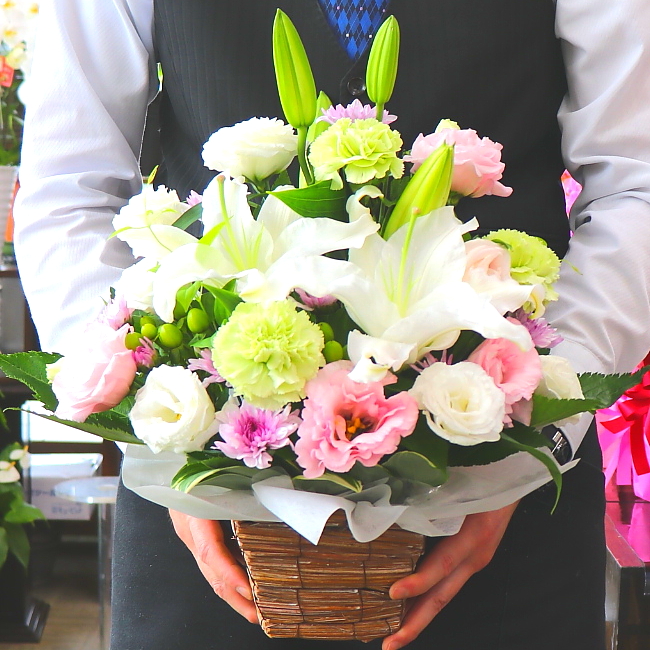 花材: メイン ユリ、カーネーション、トルコギキョウ、スプレーマムなど その他 実物類、葉物類など
