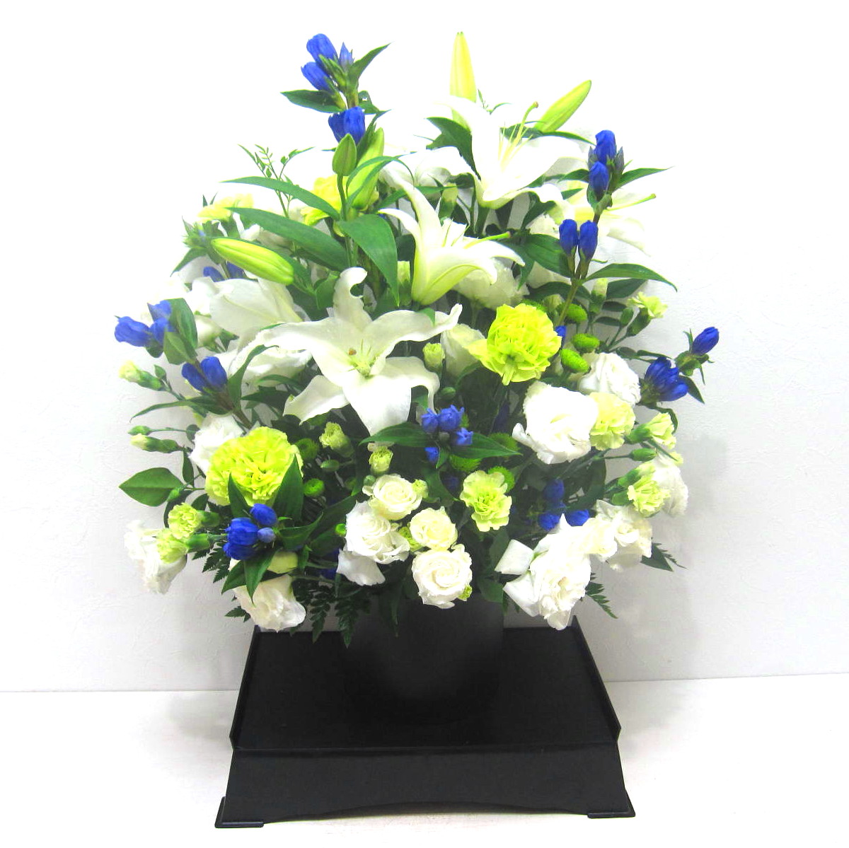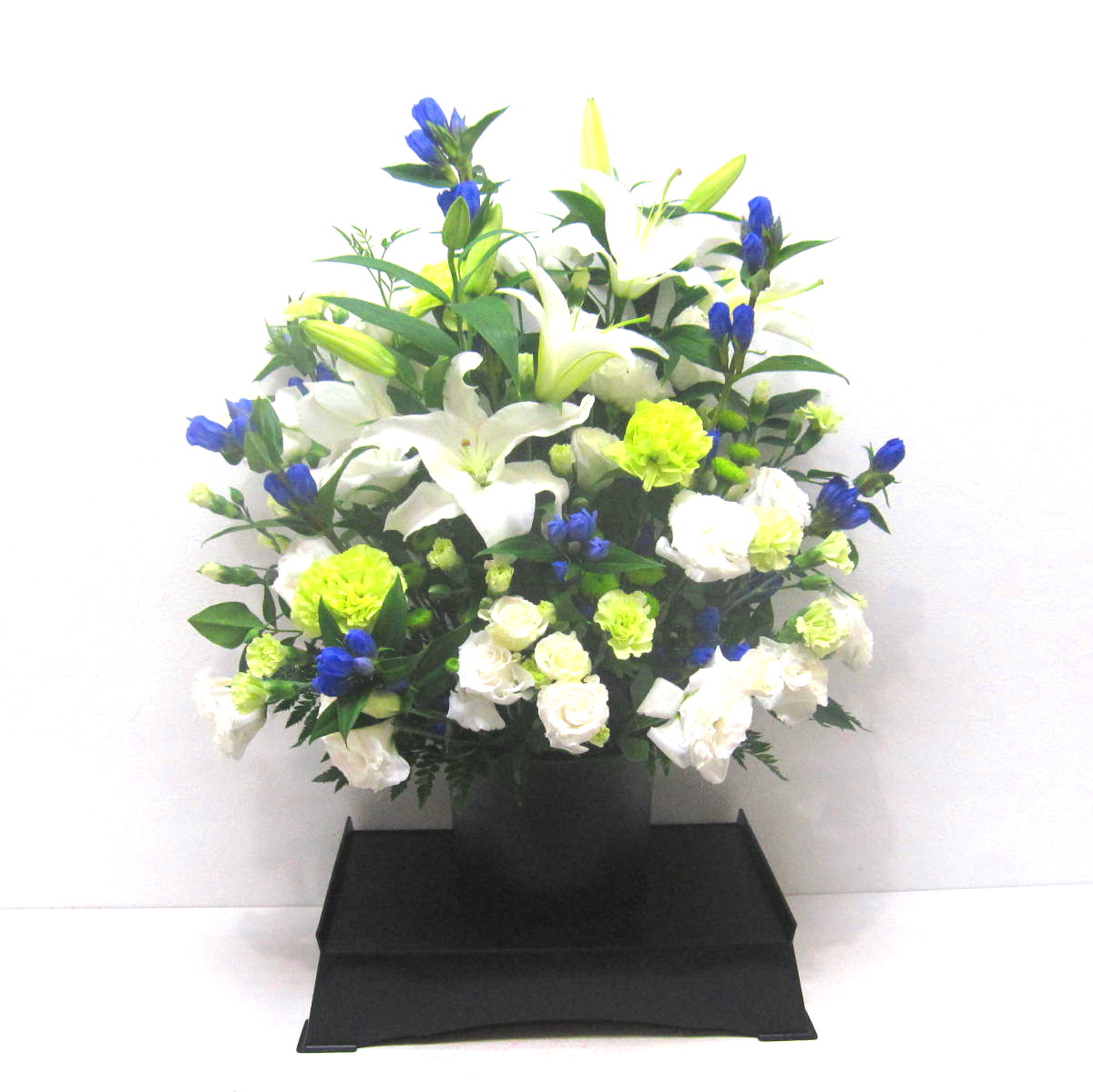 供花台付きのアレンジメント。「ユリ」や「カーネーション」など花持ちが良いお花を中心に、この時期の旬のお花「リンドウ」などを入れて控えめにお作りします。亡くなってから日が浅い故人様への贈り物にいかがですか。ご家族様やご遺族様の気持ちに寄り添うように丁寧に心をお届けします。【15時迄のご注文で翌日届きます】※こちらの商品についてのご相談、ご質問等ございましたら(メール)または(お電話)にて承ります。