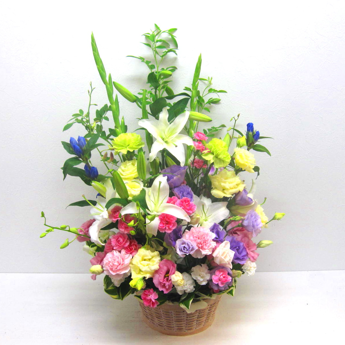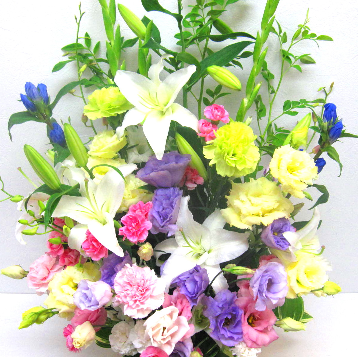 花持ちの良いユリやカーネーション、トルコギキョウを中心に季節のお花「リンドウ」などと合わせたアレンジメントです。明るい色合いなので亡くなってもう何年も経過している故人やご家族様が明るい色合いが良いとおっしゃている故人様に。目を閉じて心の中にいる故人への想いをそっと呼び起こします。故人への供養はもちろん、ご家族やご遺族様の心を癒すことでしょう。当店では、お客様のその想いをしっかりと受け止め、心を込めて制作致します。故人を偲ぶ色々なシーンで是非、ご利用下さい。