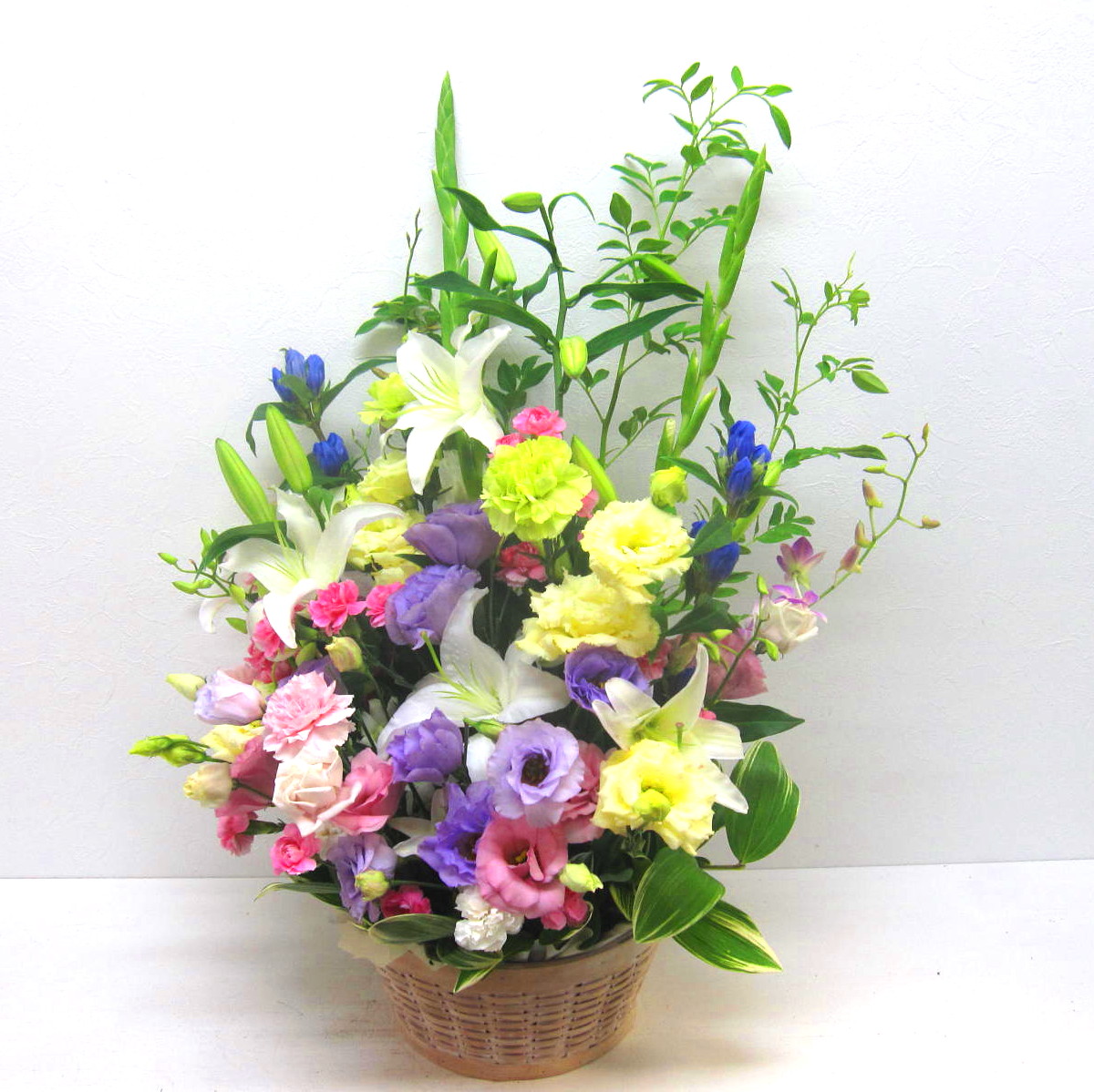 花材: メイン ユリ、リンドウ、トルコギキョウ、カーネーションなど その他 葉物類など