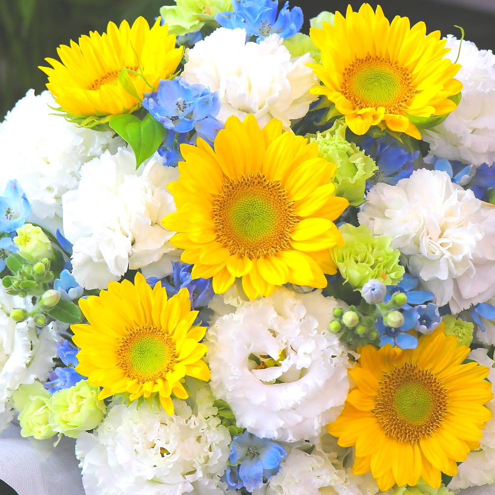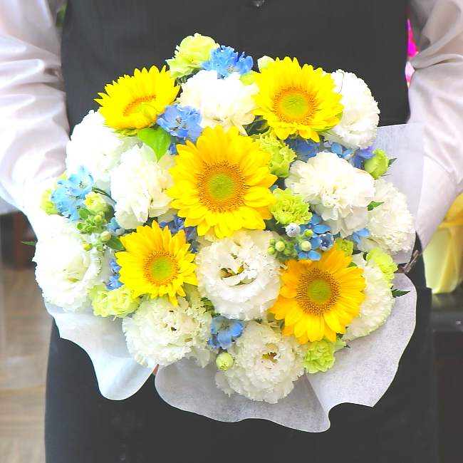 花材: メイン ヒマワリ、トルコギキョウ、SPカーネーション、ブルースター、デルフィニュームなど その他 葉物類など