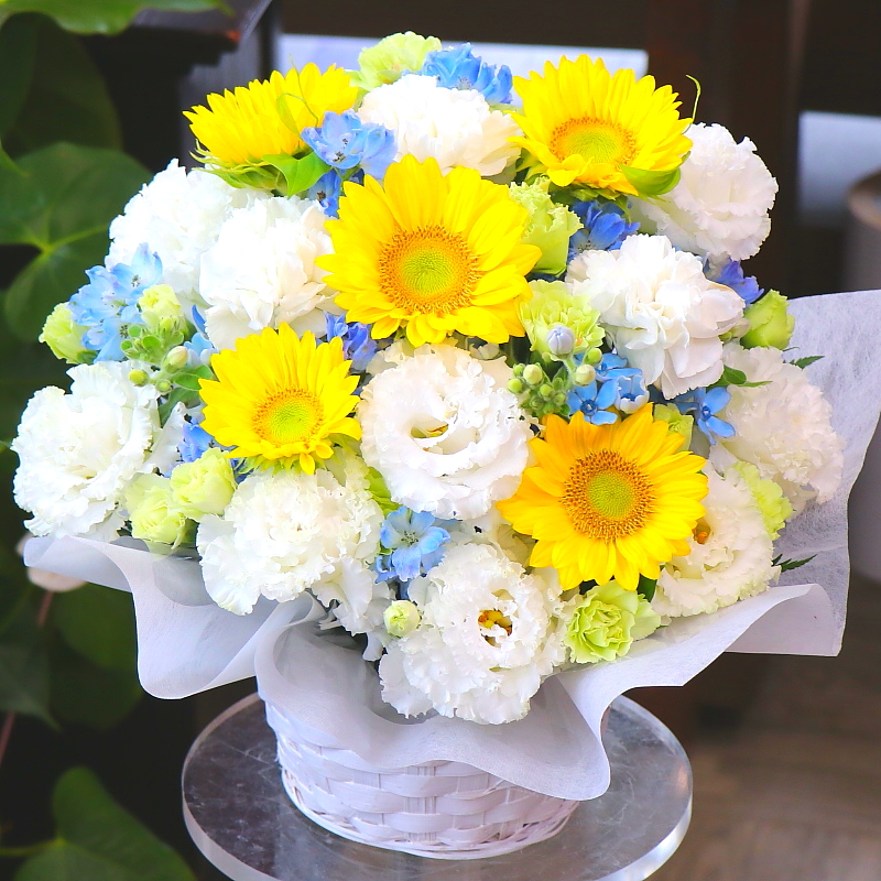 この時期に旬の「ヒマワリ」を入れたお供えアレンジメント。黄色&ホワイト&ブルー系の淡い色合いで上品にお作りします。お供え・お悔やみ、ご命日やお盆などにオススメです。【15時迄のご注文で翌日届きます】※こちらの商品についてのご相談、ご質問等ございましたら(メール)または(お電話)にて承ります