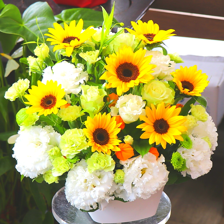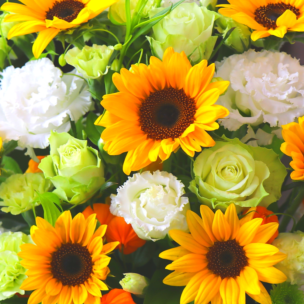 花材: メイン ヒマワリ、バラ、トルコギキョウ、マム、SPカーネーションなど その他 葉物類など