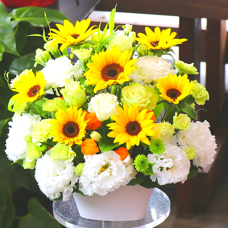 向日葵みたいに明るくかったあの人へ、向日葵のように笑顔が素敵だったあの方へ、向日葵が大好きだった故人へ。向日葵を入れたお供えアレンジメント。お供え・お悔やみ、ご命日やお盆などにオススメです。【15時迄のご注文で翌日届きます】※こちらの商品についてのご相談、ご質問等ございましたら(メール)または(お電話)にて承ります。