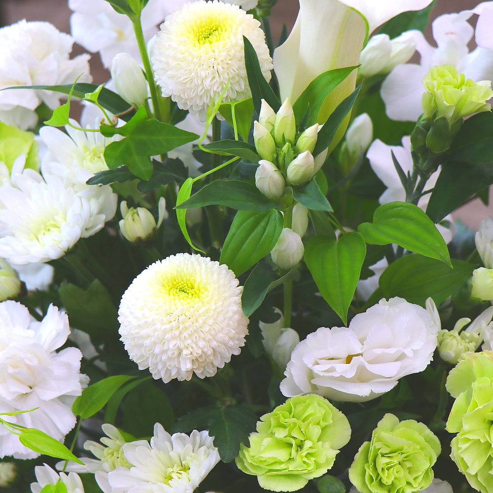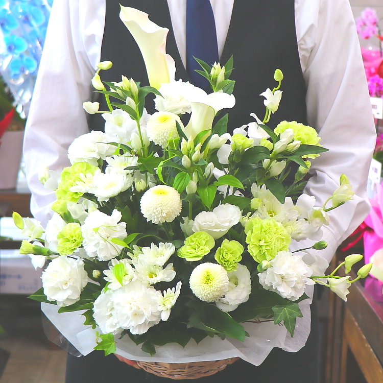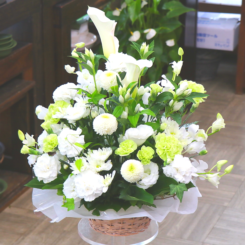 この時期、旬のお花を入れたお供えアレンジメント。「リンドウ」や「トルコギキョウ」を主体として白&グリーン系で心を込めてお作りします。【15時迄のご注文で翌日届きます】※こちらの商品についてのご相談、ご質問等ございましたら(メール)または(お電話)にて承ります。