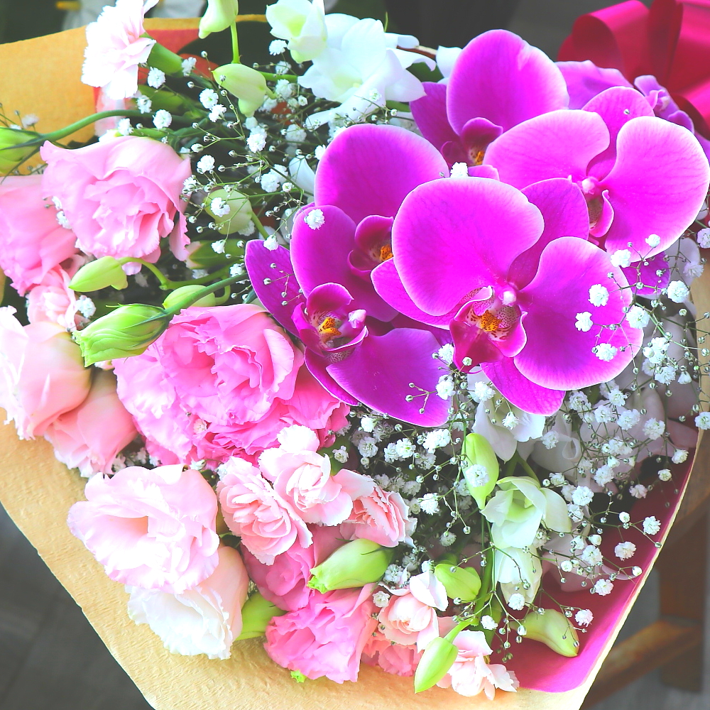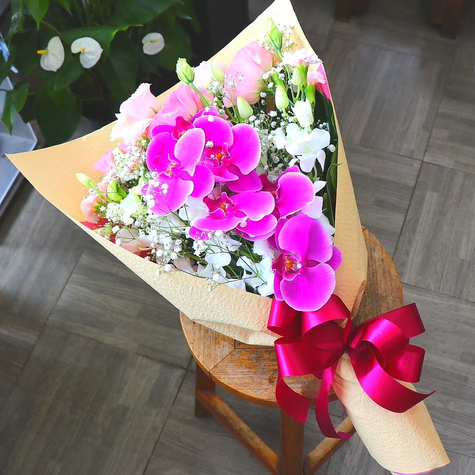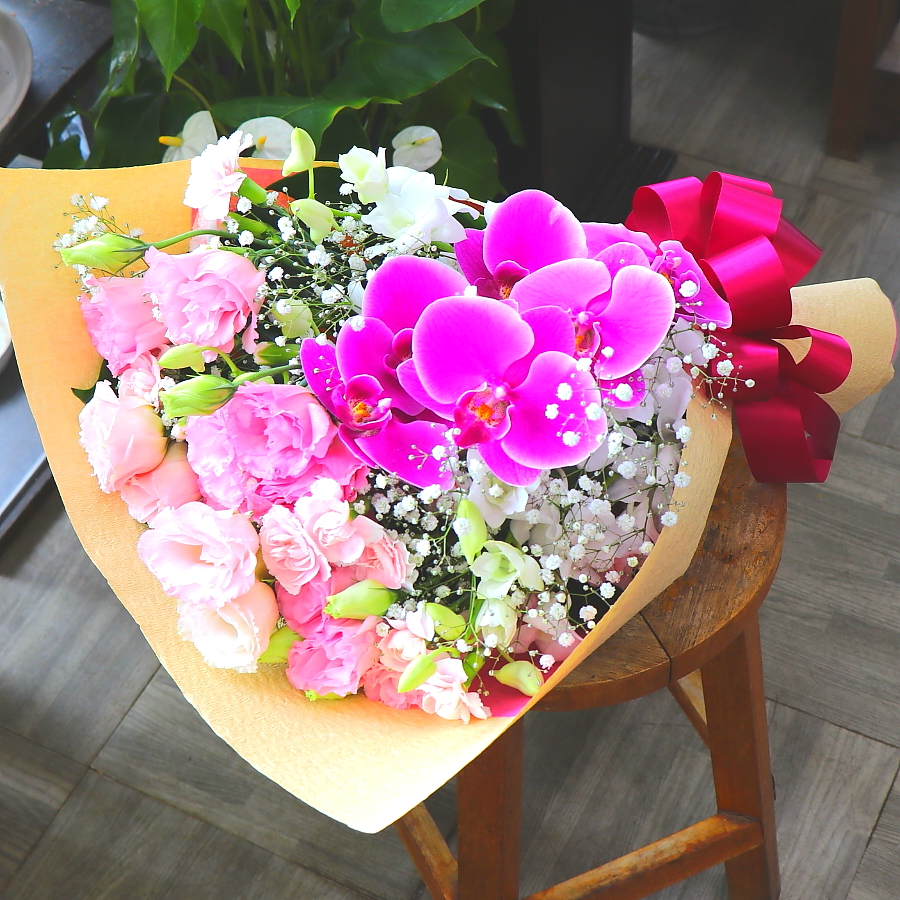 高級なお花「コチョウラン」を入れた上品な花束。さまざまなご用途にいかがでしょうか。【15時迄のご注文で翌日届きます】※こちらの商品についてのご相談、ご質問等ございましたら(メール)または(お電話)にて承ります。