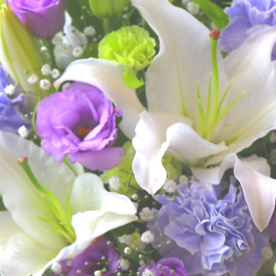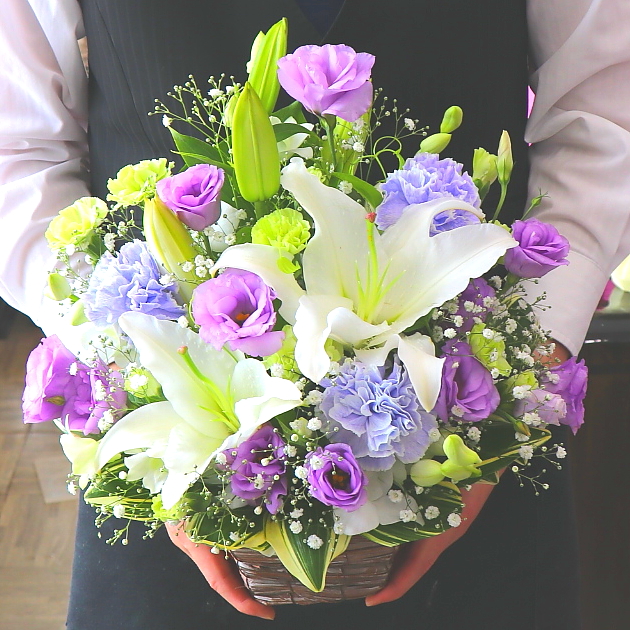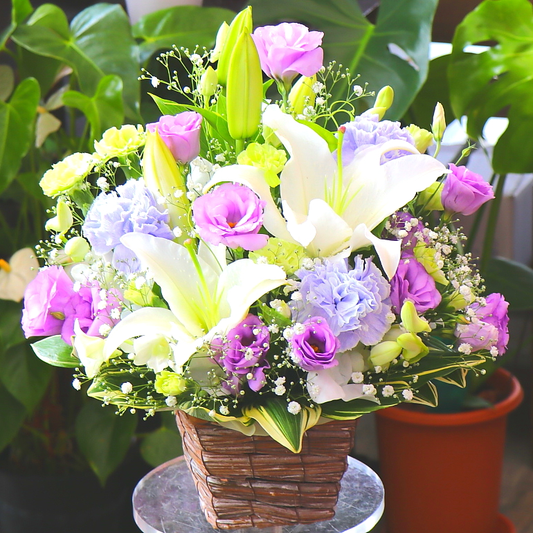 白系を基調とした淡いパープル系色合いのアレンジメントです。ユリやカーネーション、トルコギキョウなど花持ちも良いお花を中心に、控えめに上品な雰囲気でお作り致します。目を閉じて心の中にいる故人への想いをそっと呼び起こします。故人への供養はもちろん、ご家族やご遺族様の心を癒すことでしょう。当店では、お客様のその想いをしっかりと受け止め、心を込めて制作致します。故人を偲ぶ色々なシーンで是非、ご利用下さい。