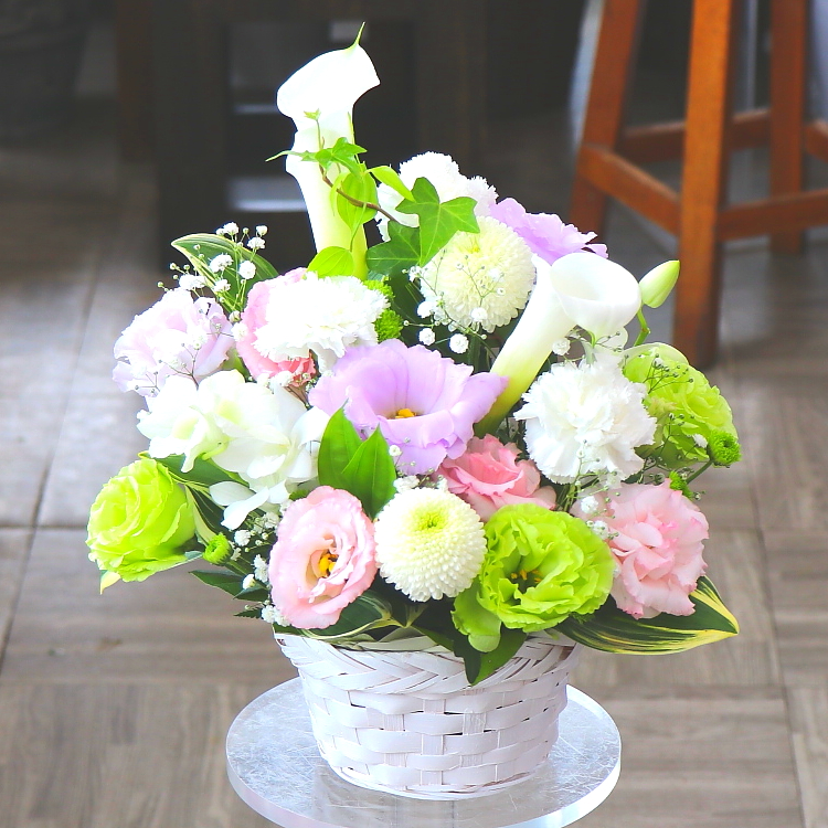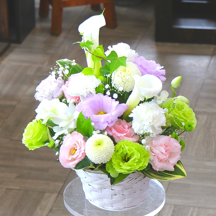 白系を主体に少し淡い色を入れたお供えのアレンジメントです。花持ちが良いお花を中心に心を込めてお作りします。目を閉じて心の中にいる故人への想いをそっと呼び起こします。当店では、お客様のその想いをしっかりと受け止め、心を込めて制作致します。静岡県から全国へお届けします。故人を偲ぶ色々なシーンで是非、ご利用下さい。