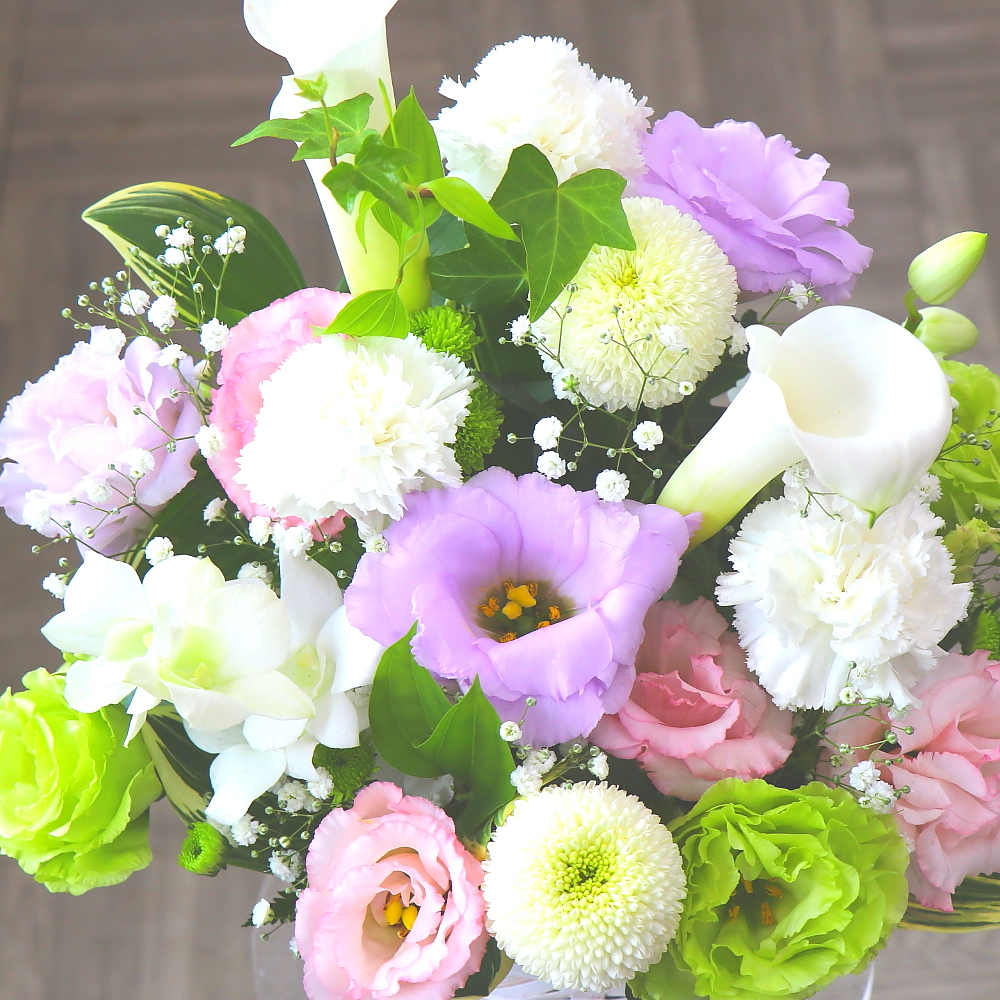 ほんわかとした淡い明るめなお供えアレンジメント。故人を偲び、ご遺族やご家族の気持ちが少しでも明るくなるように心を込めてお作りします。【15時迄のご注文で翌日届きます】※こちらの商品についてのご相談、ご質問等ございましたら(メール)または(お電話)にて承ります。