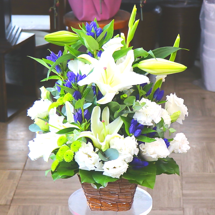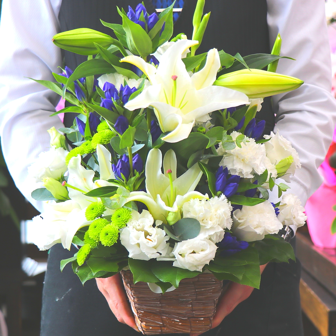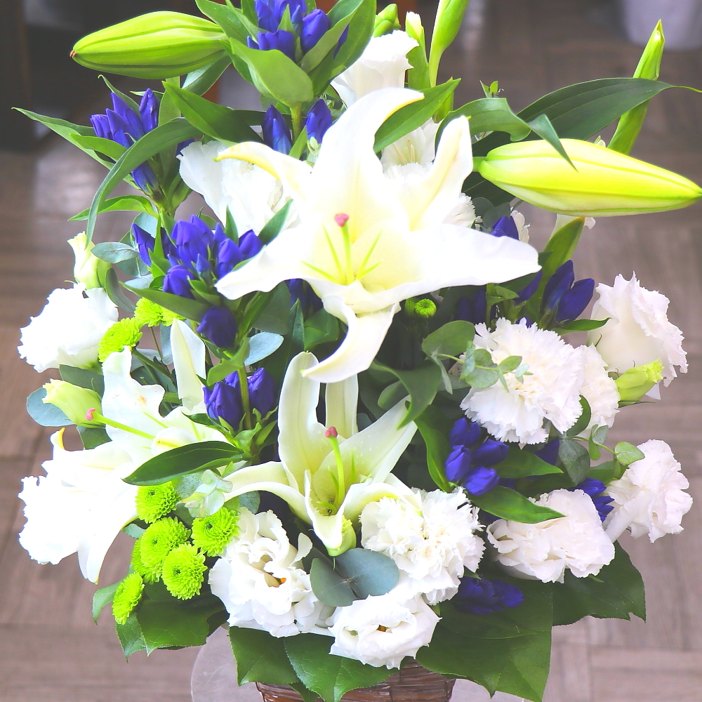 白系を基調とした白&ブルー系の色合いのアレンジメントです。季節のお花「リンドウ」を入れてユリやカーネーション、トルコギキョウなど花持ちも良いお花を中心に、上品に控えめな雰囲気でお作り致します。目を閉じて心の中にいる故人への想いをそっと呼び起こします。故人への供養はもちろん、ご家族やご遺族様の心を癒すことでしょう。当店では、お客様のその想いをしっかりと受け止め、心を込めて制作致します。故人を偲ぶ色々なシーンで是非、ご利用下さい。