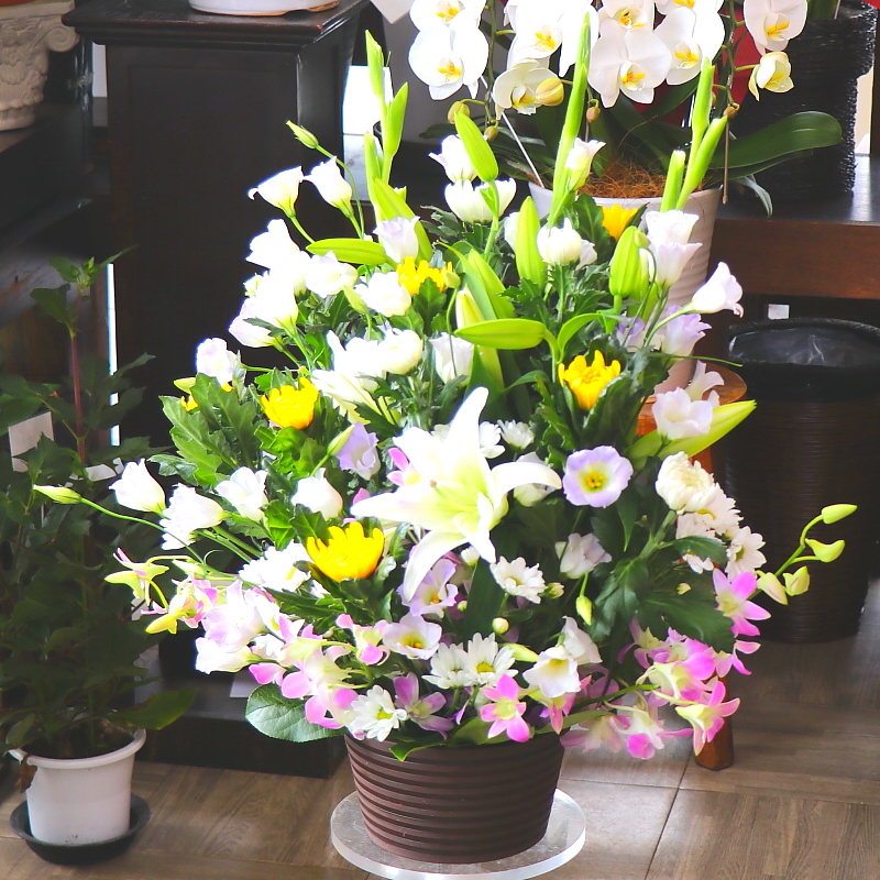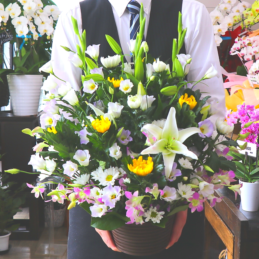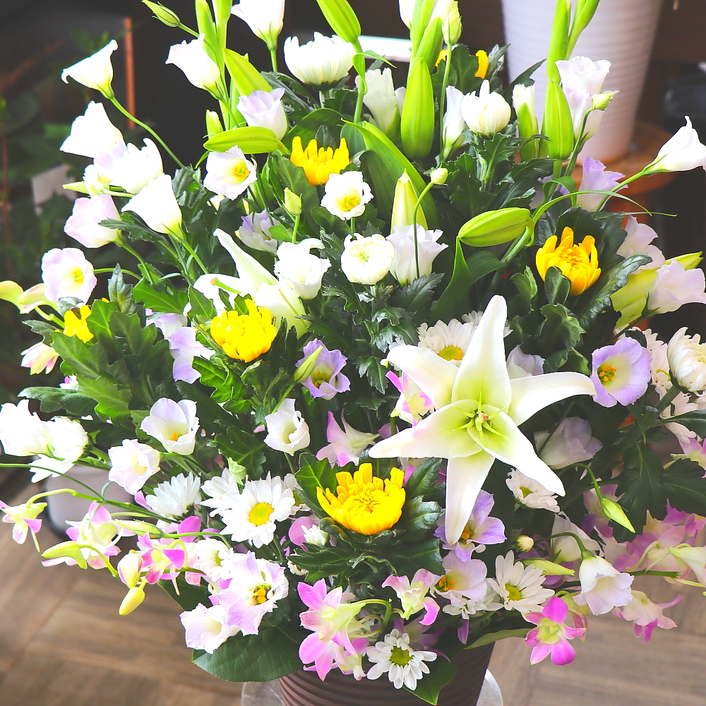 ユリやキク、トルコギキョウなどの和花や洋花を中心とした控えめなアレンジメントです。花持ちの良い花材を中心にボリューム感を出し、控えめに上品な雰囲気でお作り致します。目を閉じて心の中にいる故人への想いをそっと呼び起こします。故人への供養はもちろん、ご家族やご遺族様の心を癒すことでしょう。当店では、お客様のその想いをしっかりと受け止め、心を込めて制作致します。故人を偲ぶ色々なシーンで是非、ご利用下さい。