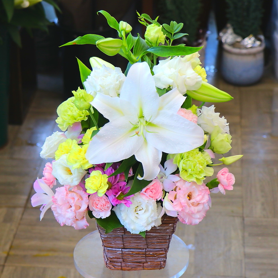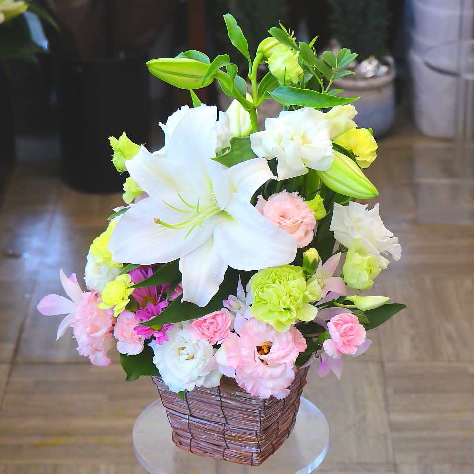 白系を基調とした色合いに淡い色のお花を入れたお供えアレンジメントです。ユリやトルコギキョウなど花持ちも良いお花を中心に、淡い上品な雰囲気でお作り致します。目を閉じて心の中にいる故人への想いをそっと呼び起こします。故人への供養はもちろん、ご家族やご遺族様の心を癒すことでしょう。当店では、お客様のその想いをしっかりと受け止め、心を込めて制作致します。故人を偲ぶ色々なシーンで是非、ご利用下さい。